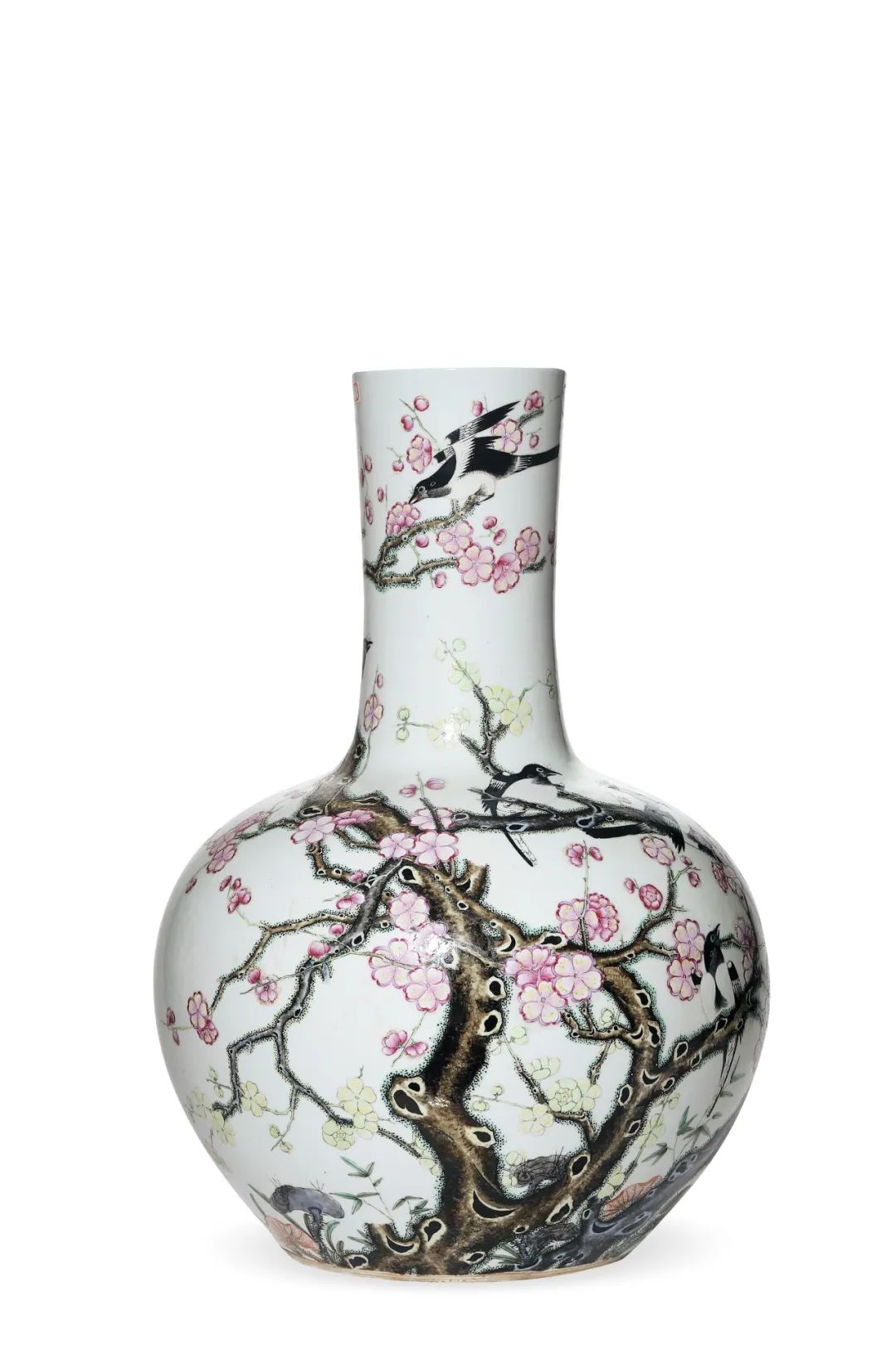 此件拍品纹饰十分吉祥。主体描绘一株老梅怒放新花,周围还描绘了姿态各异的十二只喜鹊。古人画瓷言必有意,意必吉祥。十二只喜鹊,象征一天十二个时辰,又象征一年十二个月,每时都有喜事,每月都有喜事,所谓时时见喜,月月见喜。喜鹊落于梅花之上,又有「喜上眉(梅)梢」的美好祝福。天球瓶的创制是受西亚文化的影响,瓷质天球瓶始见于明永乐朝。浑圆的腹部曲线类似古人心目中的天体星球形象,故而得名。尺寸颇大,「大瓶」寓意「太平」,厅堂陈设的不二之选。