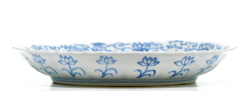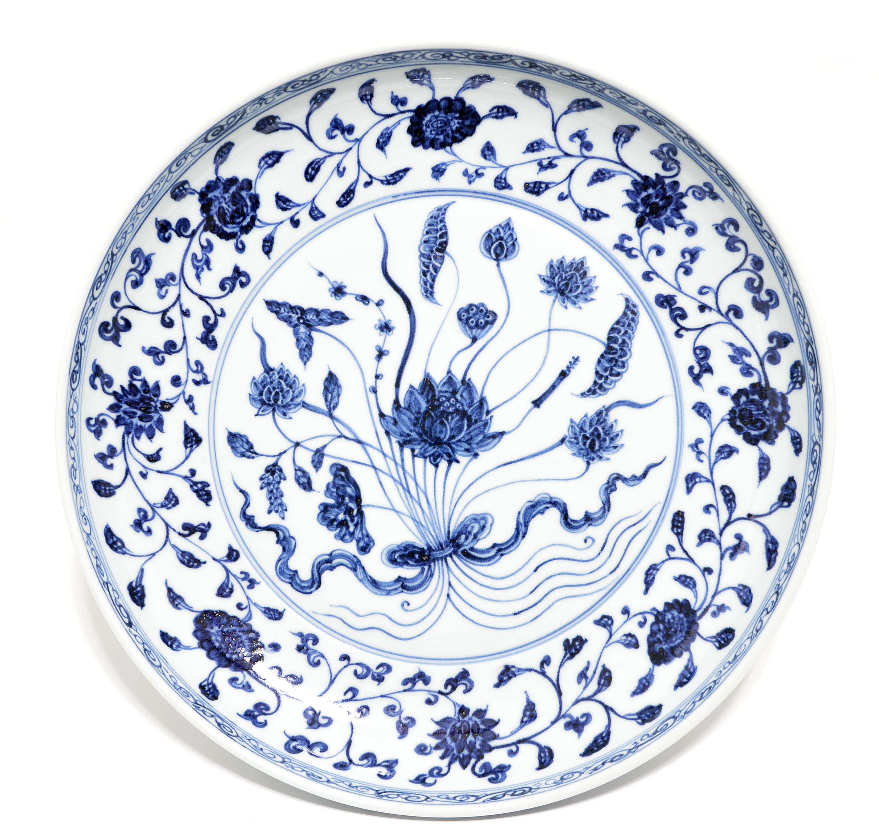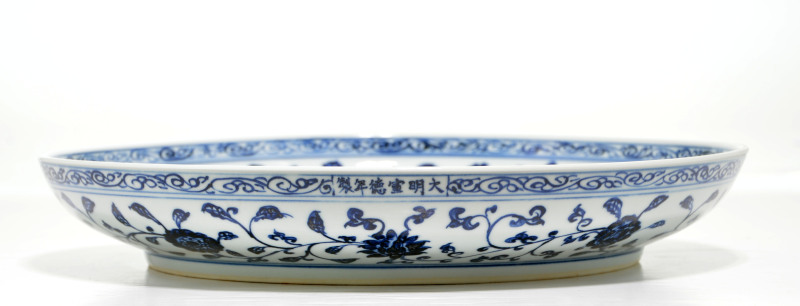 盘内以浓妍青花绘束莲纹,莲蓬、莲叶及水草以飘带系束,外绕三重同心圆环,盘壁内倾处饰缠枝花卉纹,上接波浪纹带。外壁口沿下饰卷草纹,足上方绘回纹带,其间满布缠枝花卉,青花发色浓重见铁锈斑积聚。底无釉,见宣德款识。