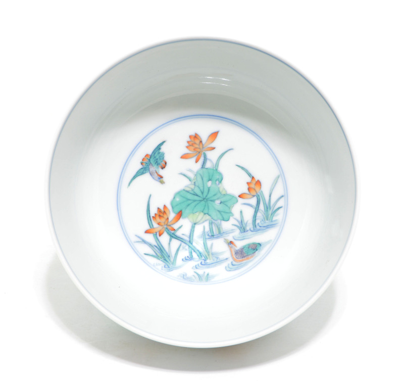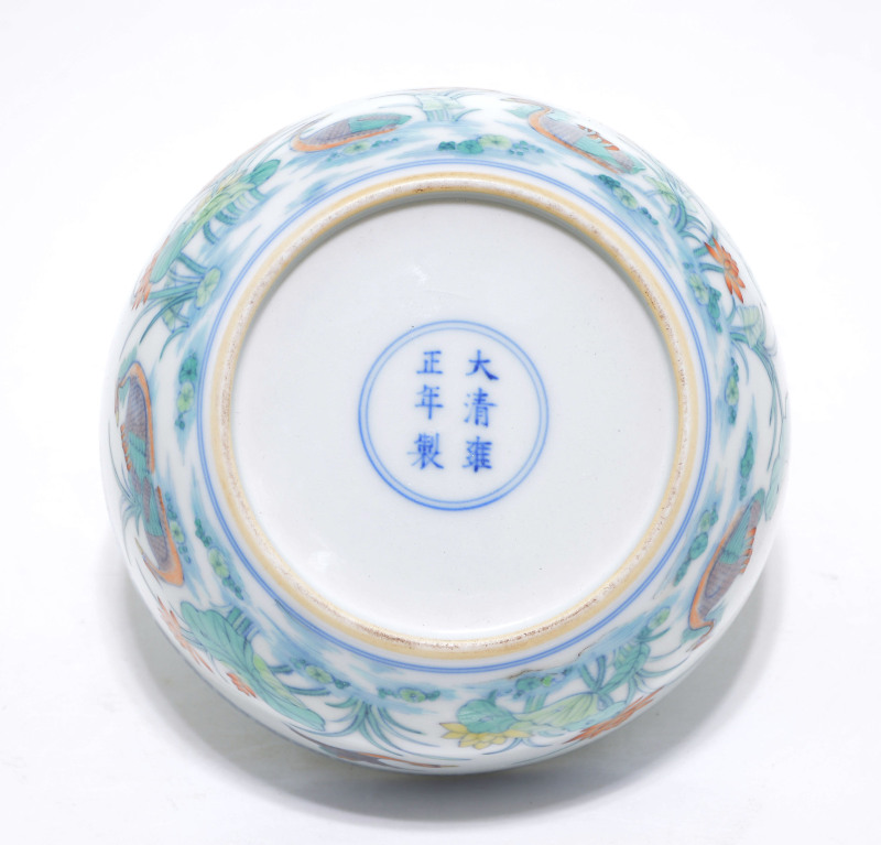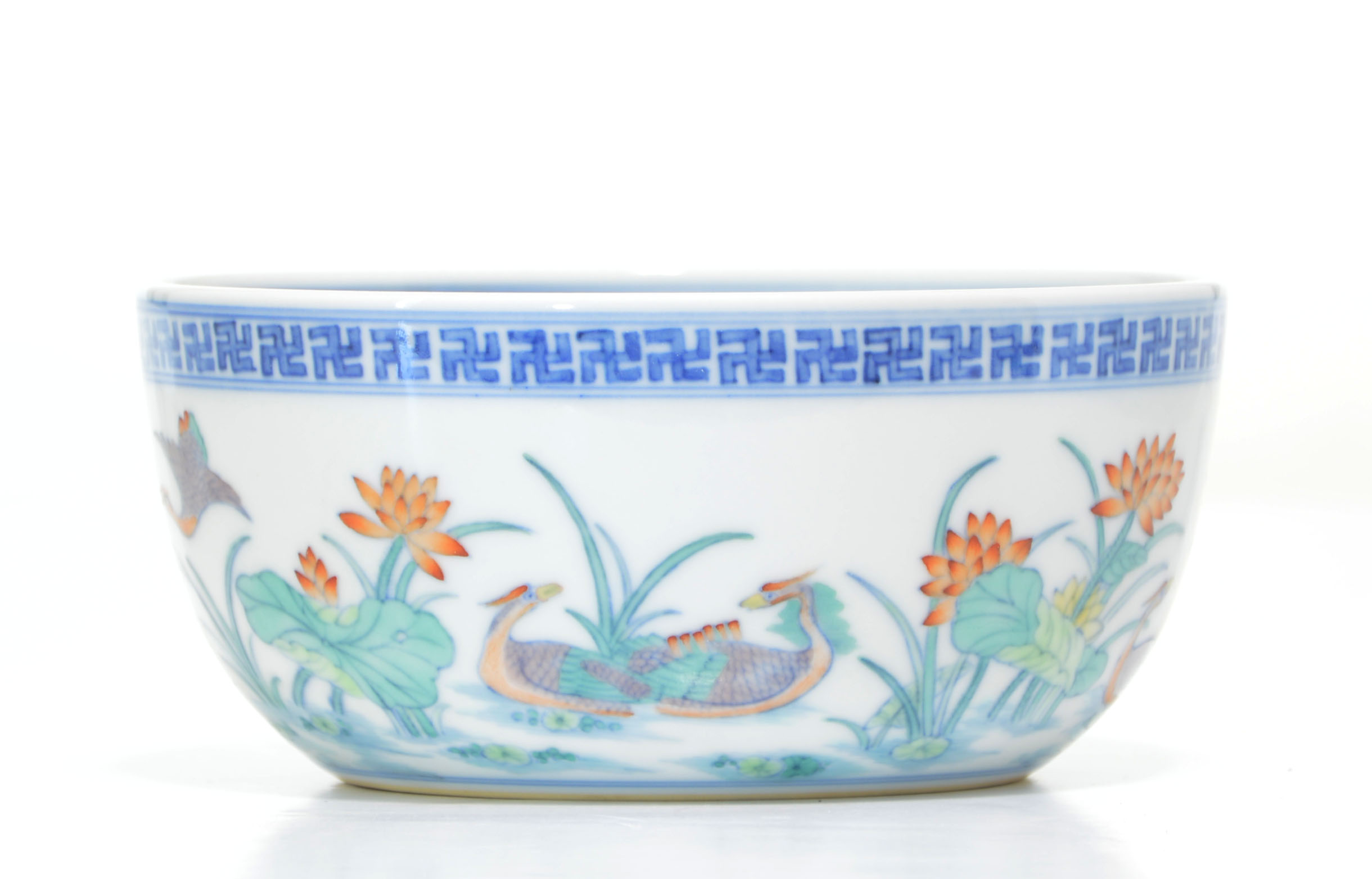 胎骨精制,弧腹高足微敛,足墙环饰卷草纹带。外壁以透亮釉彩绘池塘戏鸭通景,口沿下饰青花卍字纹连续边框,底落雍正款。