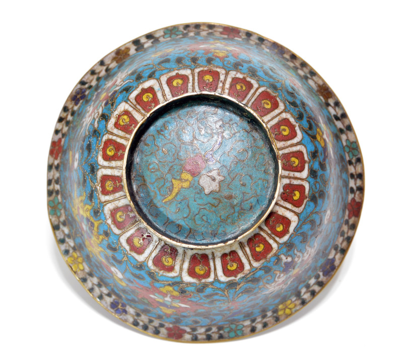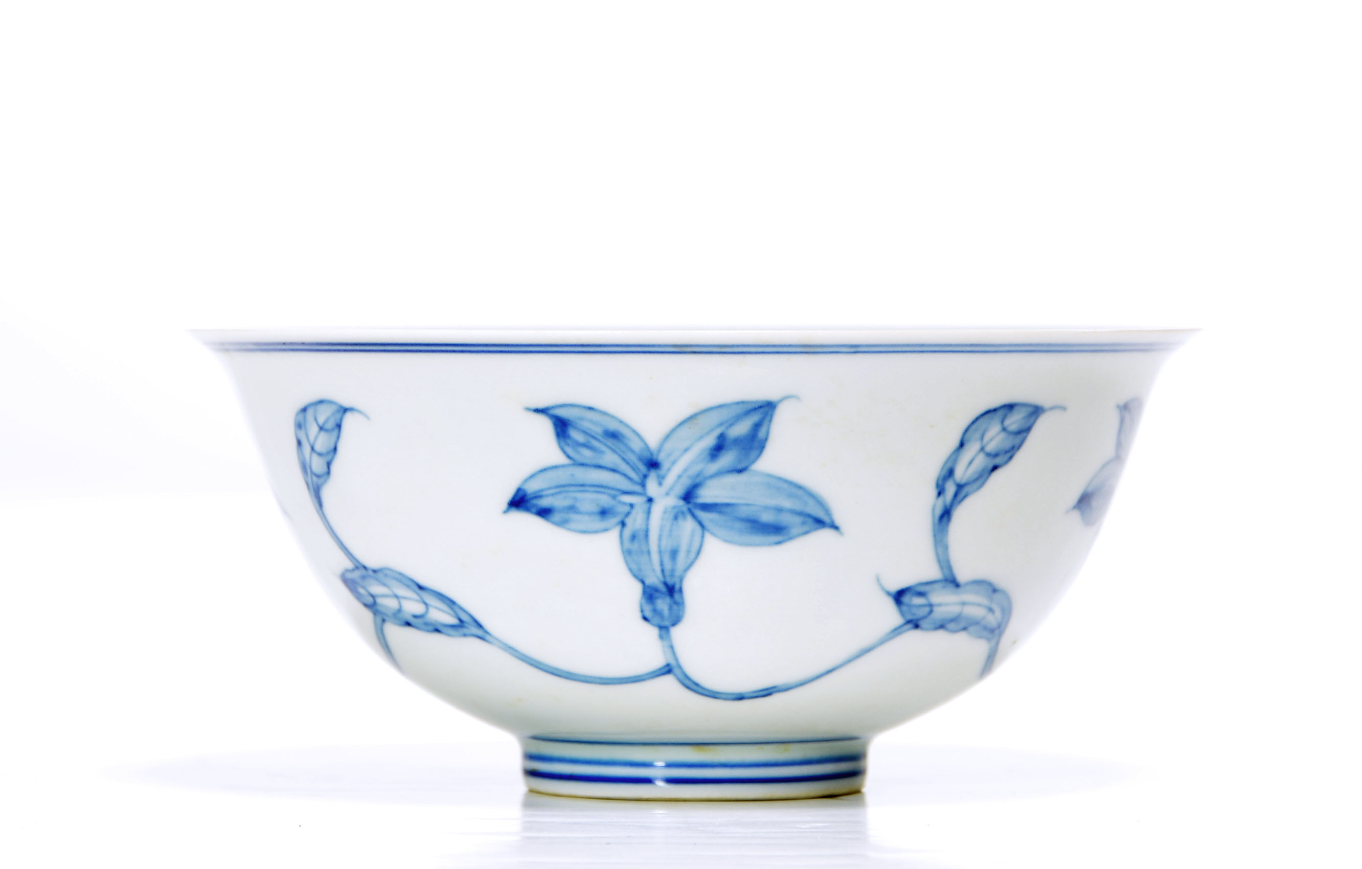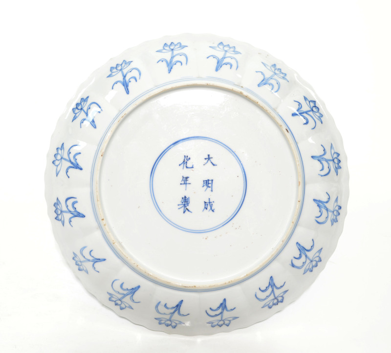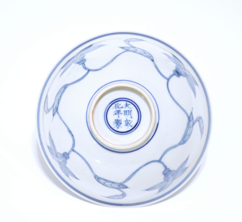 胎骨精制,深腹弧壁自敛足渐展至微撇口,釉下以淡妍青花渲染,深青边线勾勒,内外壁通饰波曲卷草纹,构成菱花式开光,缀四丛萱草纹,上下饰双弦纹边栏,底落成化款。