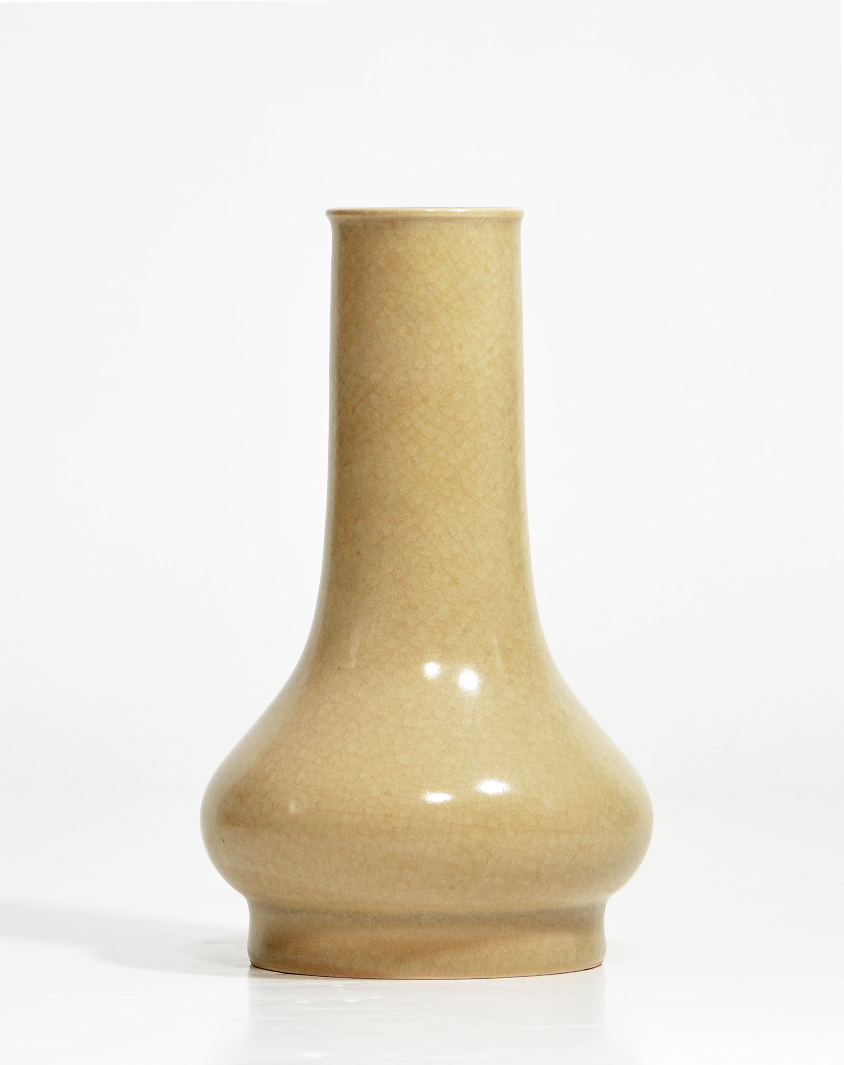 梨形瓶身,修长圆柱颈,通体覆米色厚釉,釉面网布金棕开片纹。或为宋代。