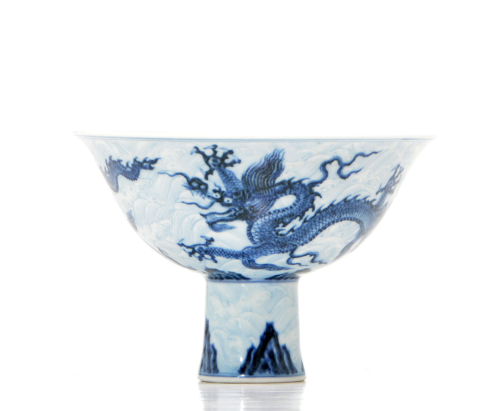 胎骨精制,深腹弧壁撇口,承中空高足。通体以浓妍青花绘双五爪龙腾跃山石间,足部环饰汹涌波涛,龙纹留白地饰,底落宣德款。