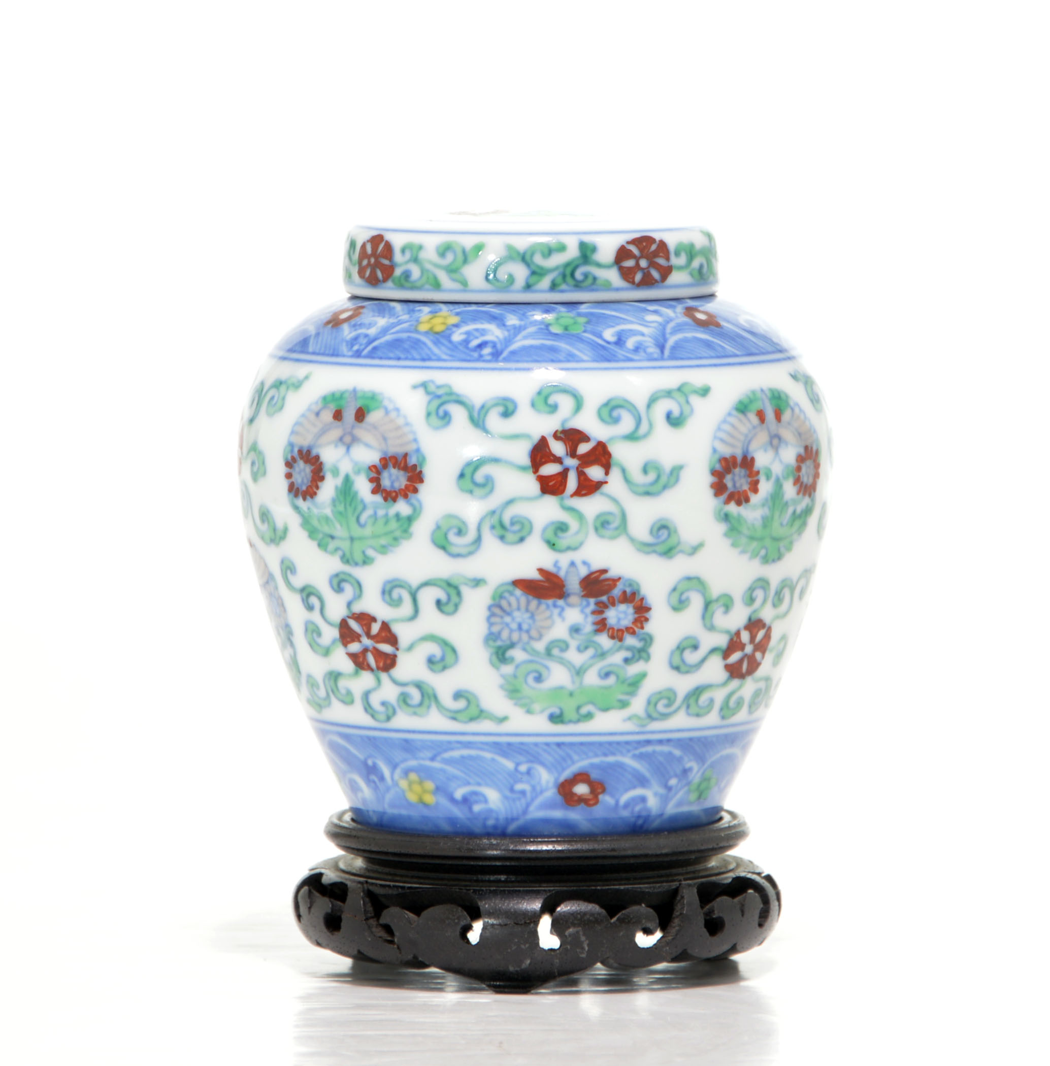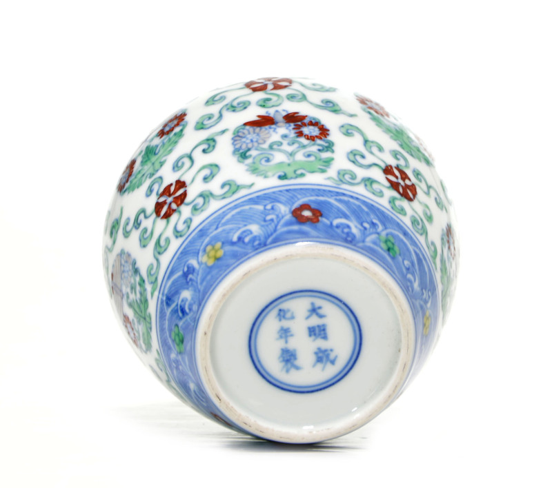 罐身釉下青花勾边,填绿、黄、矾红彩绘团菊纹,环饰缠枝卷草,平盖纹饰相配,底青花书成化款。