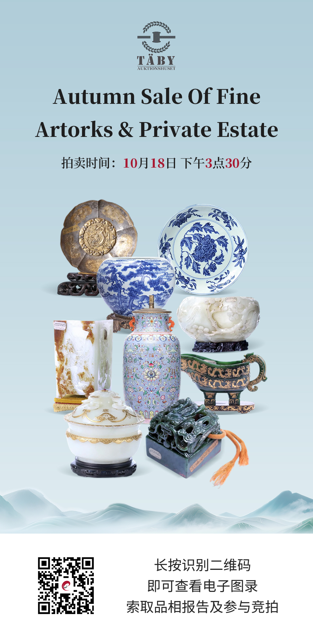 本次拍卖会精心遴选逾241件艺术珍品,荟萃瓷器、玉器、文房清玩等门类。拍品主要出自瑞典及北欧各地的私人藏家和家族,多为上世纪入藏,流传有序。其间精品佳构迭出,多为市场罕见之“生货”,诚邀四海藏家共鉴竞购。