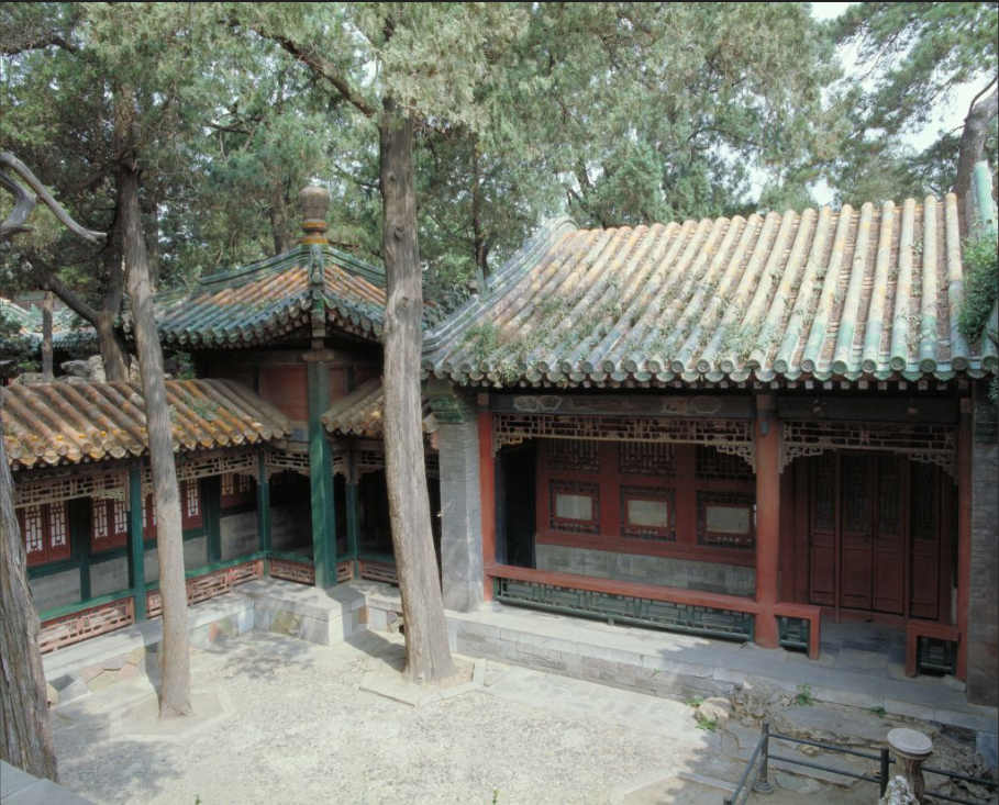 抑斋位于北京故宫外东路宁寿宫花园(乾隆花园)第一进院落东南角,建于清乾隆三十七年(1772年)。该建筑与西侧矩亭构成组合空间,命名取"抑制情绪、循规蹈矩"之意,呼应《周易》"潜龙勿用"的治国理念。作为硬山式卷棚顶的两间静室,其室内设佛堂并暗通养性殿西配殿,檐下饰苏式彩画,前后出廊采用步步锦隔扇门。乾隆帝将此作为隐秘书房,通过楹联"心田洗净全如水,鼻观清芬讵必莲"体现修身自省的功能定位。