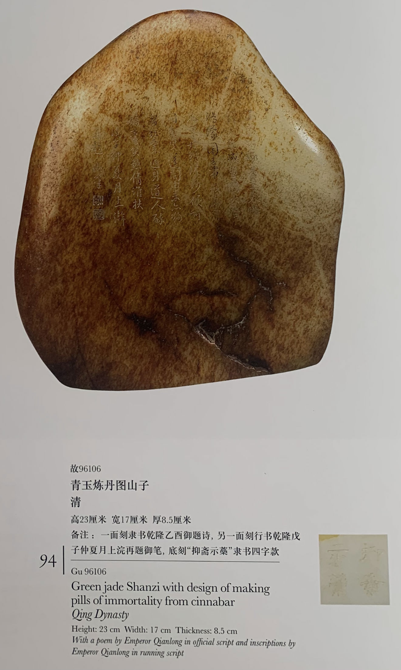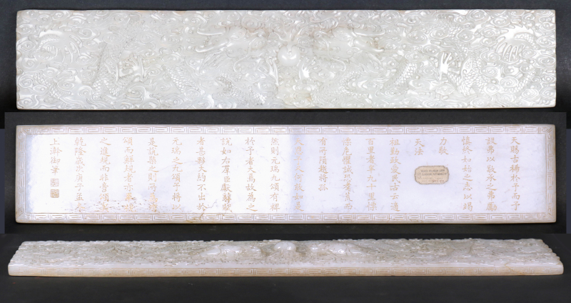 玉牌上的文字内容应为是乾隆皇帝于1780年(乾隆四十五年)所作的自传性文章《御制古稀说》,旨在总结其执政理念与政治成就。