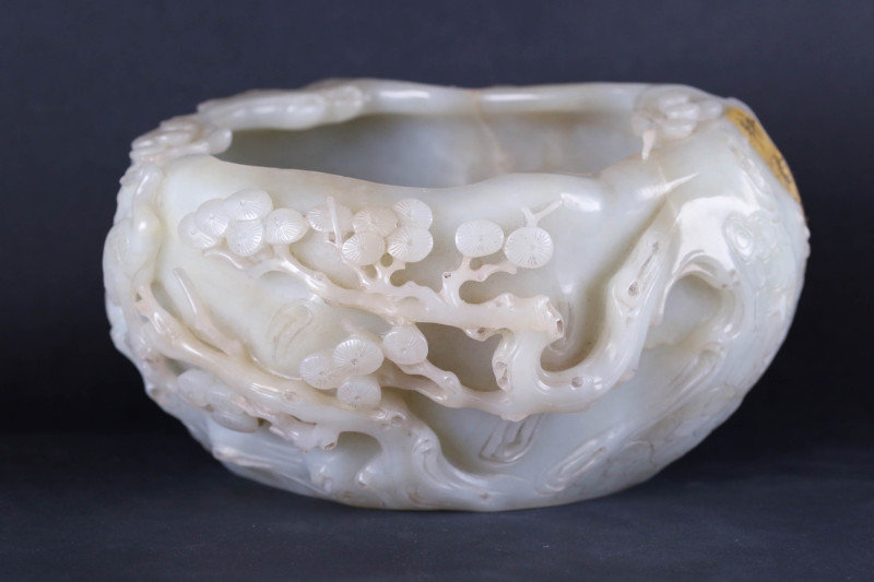 Chinese White Jade Carved Brush Washer With Zitan Hardwood Stand
