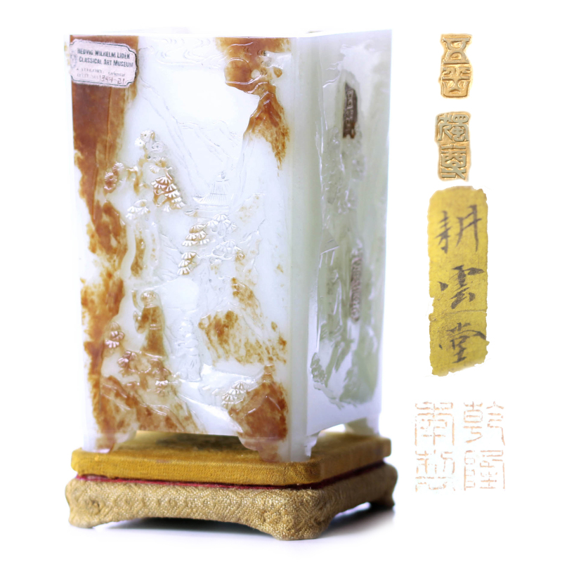 白玉雕笔筒 配座