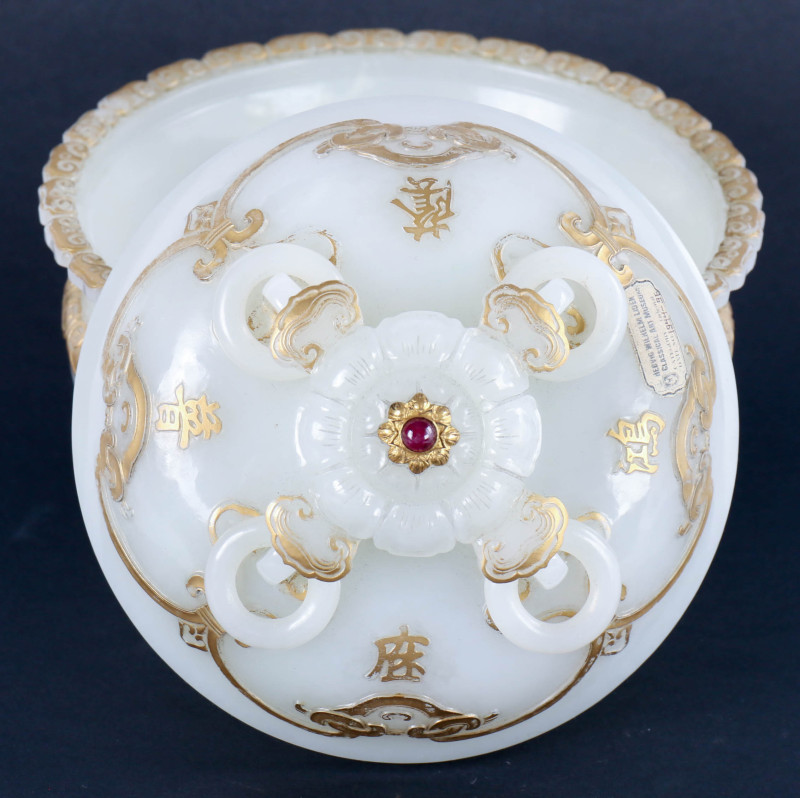 白玉镶24K纯金红宝石盖罐 配紫檀木座