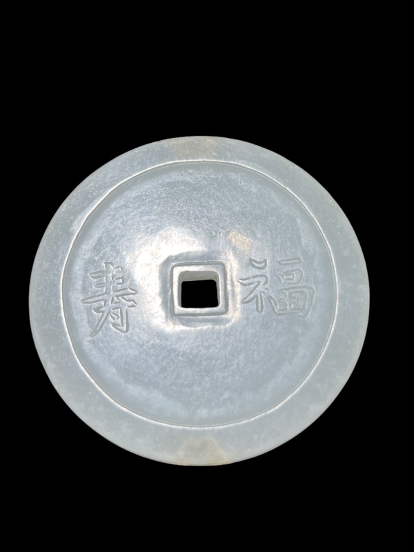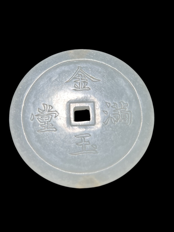 清中期时豪富之家通常会制作用于小孩佩带。“金玉满堂” 出自《老子》第九章 “金玉满堂,莫之能守”,原本形容财富极多,后来也用于比喻学识丰富。在清代,玉器上雕刻这类吉祥文字十分常见,表达了人们对富足、美满生活的向往和追求。这类玉钱除了具有装饰功能外,也可能被用作压胜钱,有祈福辟邪的寓意,常作为配饰佩戴,或是在一些礼仪、节庆场合使用 。