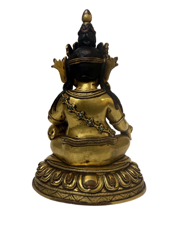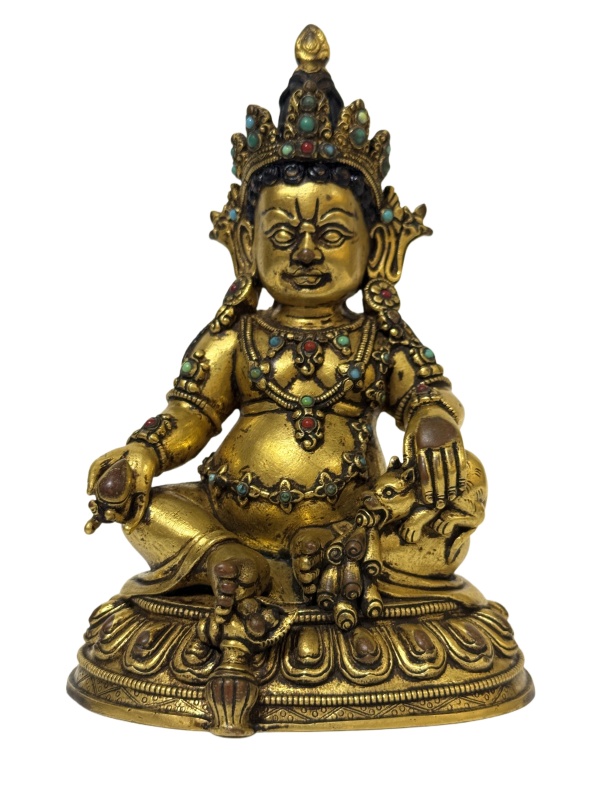黄财神是为诸财神之首,主司财富,能护持众生,使众生摆脱贫困、财源广进。右手持摩尼宝,象征能满足众生的一切愿望;左手托吐宝鼠,吐宝鼠能口吐摩尼宝珠、各种珍宝,代表着财富的源源不断。清代政治相对稳定,经济繁荣,黄财神造像的制作工艺精湛且风格多样。此像整体造型规整,线条流畅自然,身形饱满,肌肉感十足。雕刻刀法细腻,像面部表情、身上的项链、手镯等装饰细节处的纹路都清晰可辨。