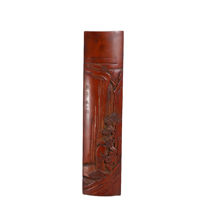 此件竹雕臂搁文房件,从图上看色泽红褐温润,包浆古朴。其上雕有山水人物图景,画面中似有林木、山石,还有人物活动其间,雕刻技法细腻,层次分明,将场景营造得富有意趣。观其款识仅有“周”字印章,清代姓周的名家或为周颢,是清代竹刻史上开宗立派的重要人物。首创 “平地花纹刻法”,在竹面上以浅浮雕形式表现山水,层次丰富,山石皴法多变,所刻树木枝干劲挺,竹叶犹如画家笔下晕染而成,具有独特的文人画韵味,常展现出峰峦叠嶂、林木葱郁、溪流潺潺的景致,给人以咫尺千里之感。