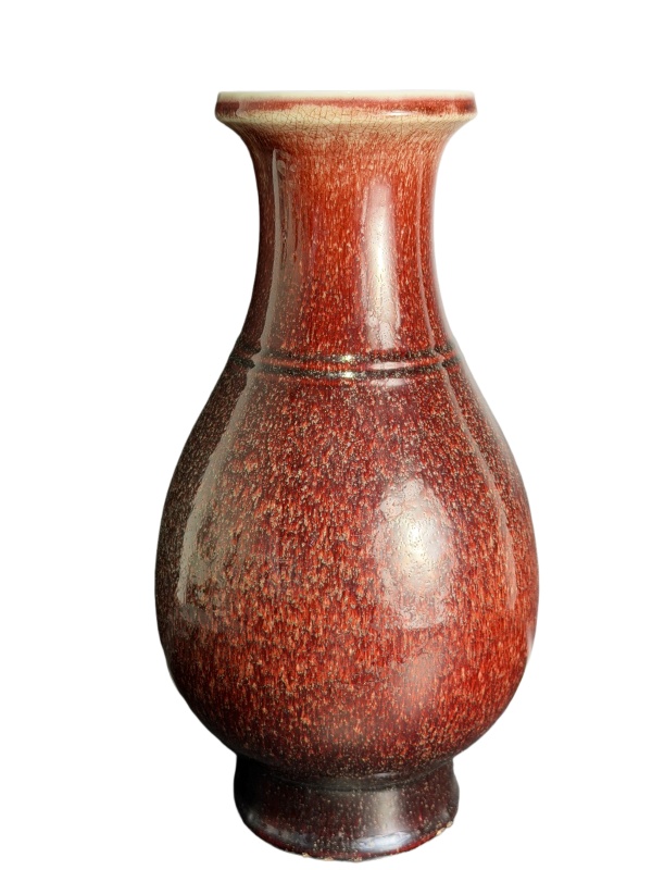 康熙四十四年至五十一年,郎廷极督理景德镇窑务时,仿明宣德宝石红釉创烧出郎窑红釉瓷器。其中,琵琶尊撇口,束颈,垂腹,二层台式圈足,造型挺拔俊秀。郎窑红尊釉层肥厚细润,釉面布满开片,口部因釉层垂流,釉层变薄透出白色胎体,底部红釉凝聚,釉色浓重,具有 “脱口垂足郎不流” 的典型特征。郎窑红尊的釉色呈 “牛血般的鲜红”,色泽深沉浓烈却不沉闷,釉面光泽如镜,每一件的釉色变化都独一无二,是 “火与釉共生” 的典范,由于烧制难度极高,成品率不足万分之一,存世量极少,在清代就已被奉为红釉至尊。