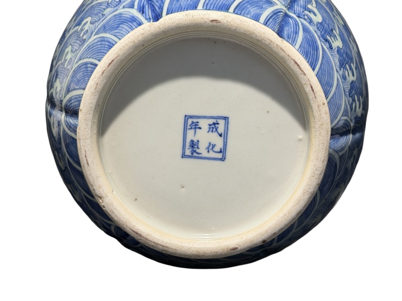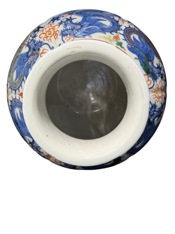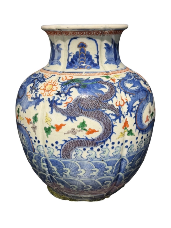 此件巨型尺寸石榴尊,创造性地运用多种复杂工艺,集斗彩、青花、五彩,甚至釉里红熔于一身,所绘五爪龙纹或为清晚至民国时期王府定制贺寿等特殊场合使用之作。