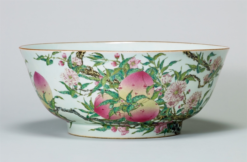 侈口深腹,外壁以粉彩密繪老樹蟠枝,桃實累累,間飾花葉,寓「長壽富貴」,枝幹作褐黑苔點皴染,桃面見點彩暈染層次分明,口沿赭彩護口,內壁開光繪南極仙翁倚鹿而坐,圈足內另飾一枝壽桃。蟠桃亦稱「壽桃」、「仙桃」,傳說西王母的蟠桃三千年一開花、三千年一結果,食之可延年益壽,因而有吉祥、長壽之寓意。而「九」與「久」同音,象徵長長久久、長壽綿延,故「九桃」有「長壽久安」的吉祥涵義。粉彩九桃紋為御窯廠重要經典圖案之一,最早可追溯至清雍正時期,如北京故宮博物院庋藏清雍正〈粉彩八桃天球瓶〉(圖一),此外,雍正官窯粉彩瓷器多繪八顆蟠桃,乾隆時為追求吉數則多為九顆蟠桃,因此又有「雍八乾九」之說。