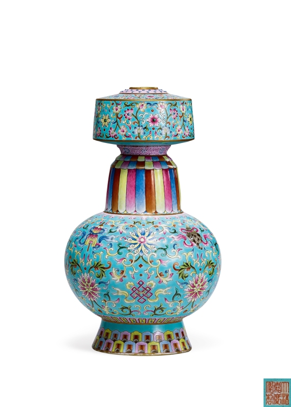 賁巴瓶起源於藏傳佛教,是藏語中「瓶」之意,最初多以金、銀、銅等金屬製成,作為密宗修行及佛教儀式中盛裝淨水、灌頂和沐佛用的法器。其形制類似唐代淨瓶,早期造型多模仿塔形,配有流口但無柄,使用時手握壺頸。《佛學大辭典》中曾寫道:「天竺國王即位時,以奔巴壺盛四大海之水灌於頂而表祝願,密教效此世法,於其人加行成就。嗣阿犁位時,設壇而行灌頂之式。」賁巴瓶在藏傳佛教密宗修行儀式中十分重要,常用於灌頂、灑淨、加持等法會,俗稱「藏草壺」或「藏草瓶」,因為常在瓶中插放草以供禮佛之用。 瓷質賁巴瓶的燒造起於清代康熙年間,早期瓷賁巴壺造型借鑒唐代淨瓶,雍正時期開始有甘露瓶樣式出現,到了乾隆時期,賁巴瓶發展出「寶瓶」和「寶瓶加流」兩種新造型,造型多樣且裝飾華麗。清代瓷製賁巴瓶是藏族金屬製品向瓷器轉化的結果,代表漢藏文化在工藝上的融合,賁巴瓶作為宮廷藏傳供器的重要母題,嘉慶一朝仍沿祖制,其中松石綠地粉彩與纏枝番蓮相配之格局尤為時尚。