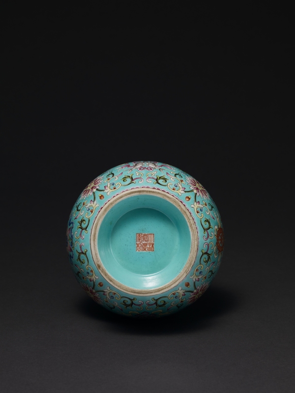 本器採用粉彩工藝,即一種在明五彩的基礎上發展,借鑒銅胎琺瑯彩的製作方法,在康熙年間創燒的新品種瓷器(註1),其特色在於運用含砷的玻璃白打底(註2),再以色彩渲染技法繪製圖案,使色彩粉潤柔和,富麗典雅。此器外器壁繪以九顆碩大的蟠桃紋飾,象徵長壽吉祥,並融合了富貴與壽考的祝福。蟠桃自古被視為仙果,寓意健康長壽與福壽雙全,九桃更象徵著長久與圓滿。此器之粉彩九桃紋描繪細緻,桃枝蜿蜒交錯,花葉繁茂,色彩巧妙運用粉紅、嫩黃、淺綠等柔和色調,展現出粉彩彩繪的高超技藝,同時釉質也是細膩光潤,整器不僅線條流暢且構圖勻稱,盡顯乾隆時期瓷器的奢華風格。