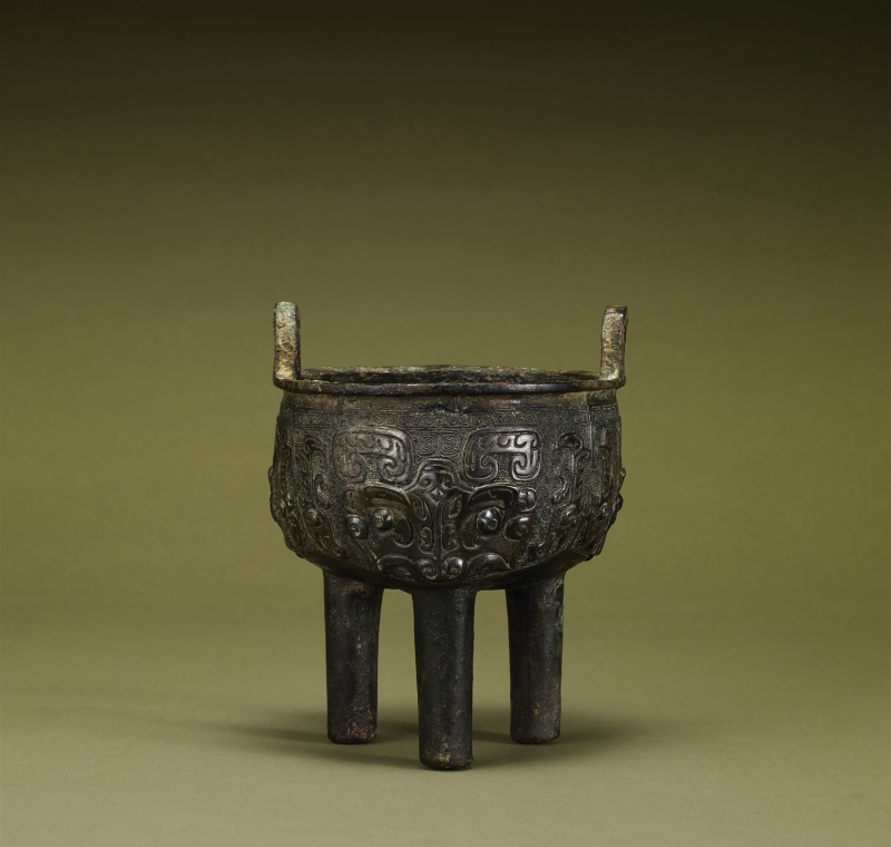 青銅鼎,圓腹深壁,口沿平直略外侈,口沿厚重,上置一對豎耳,耳作梯形片狀;器身等距三柱足承托,三足挺直,腹外通體飾紋,口沿下繞以一周連續渦線地紋,腹部作成組獸面紋,主紋起伏,眼際以浮雕圓點展現獸面紋的立體感,內壁圓弧,見自然氧化與陳舊痕。器表呈灰白至綠褐色斑駁銅鏽,局部可見清理與磨蝕痕。 商周時期的青銅鼎造型沉穩莊重,通常以三足、雙立耳、鼓腹的結構為主,鼎身曲線圓潤,重心較低,表現出飽滿端莊的視覺效果。獸面紋呈現神秘肅穆的藝術風格,不僅裝飾功能強烈,更象徵著權力與祭祀的神聖性。