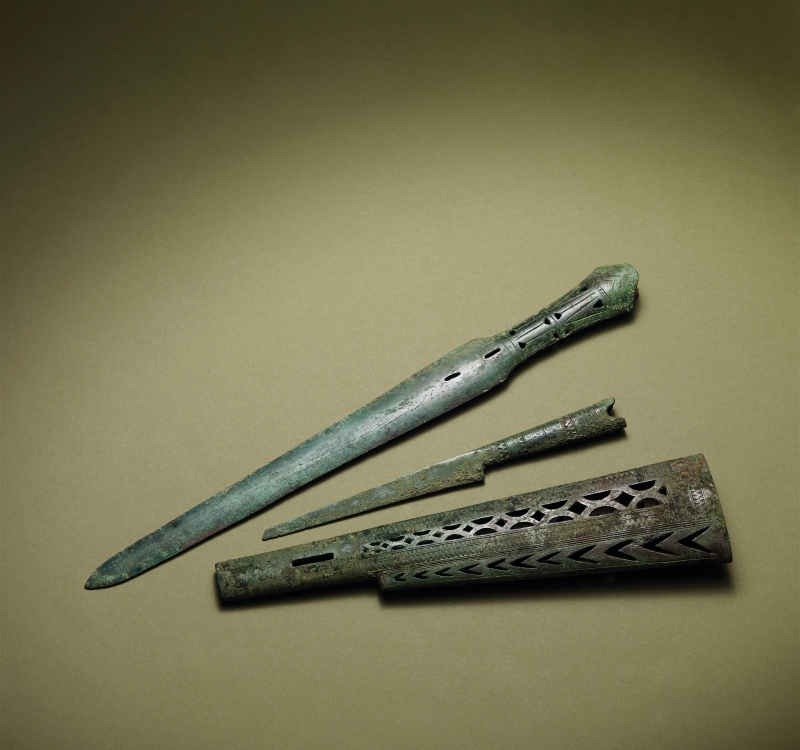 銅透雕幾何紋雙聯鞘銎柄直刃短劍
