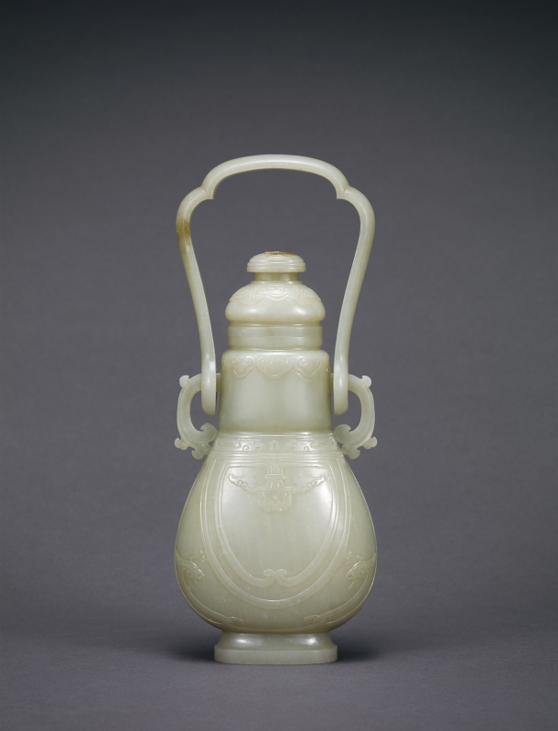 以整塊細膩的青白玉料琢刻而成。整體呈扁圓體,壺身橢圓,束口長頸,垂腹,外撇高圈足,頸部設有雙夔耳,耳內套以提樑,蓋作寶頂式。通體以陰線刻卷雲、如意紋與開光裝飾,玉質青白,局部見色根。本器為清代仿古玉器的代表作。提樑卣器型仿商代青銅卣,提樑頂端通常飾有如意紋或曲線,紋飾多為如意紋、夔鳳紋、獸面紋等。本器器型紋飾刻劃清晰精美,層次分明。 類此玉器不僅工藝複雜,對材料的要求也相當高,體現了清代宮廷對玉器制作的高度追求和技藝水平。清代提樑卣的造型多取材於乾隆時期官修的《欽定西清古鑒》,該書輯錄了大量清宮收藏的古代青銅器,為乾隆仿古玉器制作提供了範本。清朝通過軍事平定新疆地區,保證優質和闐玉的運輸,並以法律形式將其列為皇家壟斷,乾隆皇帝時期是和闐玉器制作的鼎盛期,宮廷選料講究、工藝精湛,玉器形式多樣,其中提樑卣不僅是實用的盛酒器具,也具備很高的藝術和文化價值,它融合了清代對青銅器形制的仿製與創新,紋飾寓意吉祥,既是皇室陳設也是哲學審美的載體,是清宮玉器中極具代表性的珍品。同形器可見國立故宮博物院庋藏〈玉提梁卣〉。