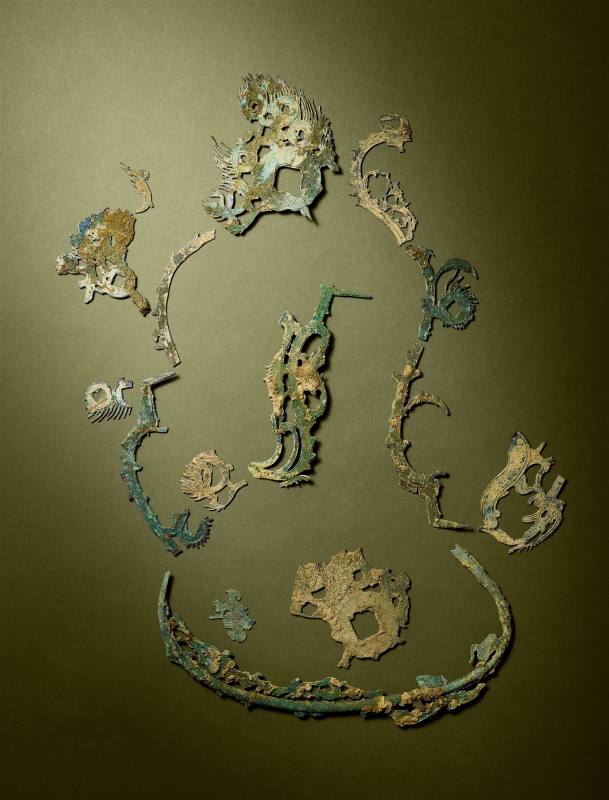 本器為四川系東漢墓葬中可見的搖錢樹之枝葉殘片,薄片式青銅鏤空,邊緣見合範鑄縫與鑄瘤,局部保留銼修痕,紋飾以龍、鳳與卷雲為主,穿插若干化錢式圓孔與方孔,兼具象徵財祿與減重、穿榫功能。器物上可見冠羽高聳之鳳鳥、卷鬚張口之龍以及雲葉、靈芝等仙界語彙,構圖與四川葬俗中「升仙致富」的信仰相合。原器應由陶或青銅座、主幹及數層枝葉組成,表面呈孔雀石綠與石青藍交錯鏽層,為研究東漢蜀地之文化、金屬工藝與宗教圖像的有力標本。