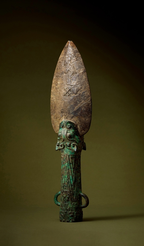 本器由雙聯鞘、直刃和短劍三部分組成,雙聯鞘及柄部分裝飾複雜的幾何紋樣,刃及劍身光素,線條刻劃精細,屬歐亞大陸草原早期游牧人文化兵器。青銅兵器中以各式短劍最具特色,包括銎柄式直刃或曲刃劍、短莖式曲刃劍、Т形柄曲刃劍、直柄直刃劍等。1985年內蒙古甯城小黑石溝出土的西周晚期至春秋早期〈雙聯鞘銎曲刃長劍〉,同樣與本作為雙聯鏤空三角紋劍鞘,可作為參考依據。山戎部族雙聯青銅短劍鞘與本件作品風格相近,在其它同時期文化中所未見,技術相當進步,亦可代表此時期短劍中之精品。