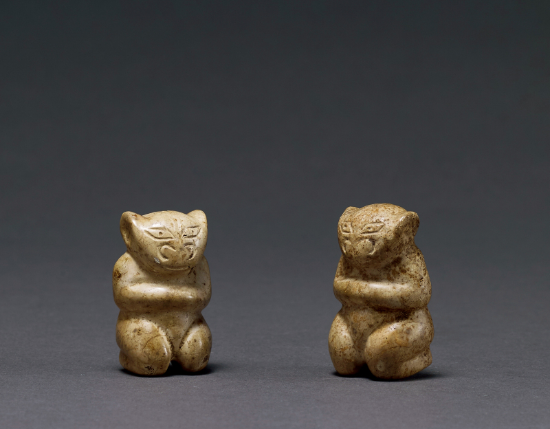 以青白玉圓雕而成一對握豬,玉質透亮,帶有光澤。握豬型呈長筒狀以利手握,面部以淺浮雕加陰刻線塑出豕之圓眼、短吻、折耳與伏臥四蹄,背脊弧線順勢環繞器身,腹下以利角刻出連續折線,形成漢代玉獸常見的「線條造型」語彙。器表可見蜂蠟狀拋光與流水樣細密磨痕,陰刻槽底圓潤,局部留有黃褐土蝕與白色沁蝕沿天然紋理滲入的現象。 握豬,亦作握豕、握豨,握豬是漢代隨葬「握」類玉器中最具代表的經典之一。其斷面飽滿、尺度適中,圓筒體符合手掌握持的人體工學,兩端一作豕首、一作尾脊的抽象處理,使整體既可識別動物形,又保持手感的圓潤安全。豕在先秦至漢被視為家宅與富足之徵,如「家」字下「豕」是古文字學常舉之例。漢人喪葬觀念強調「厚葬以全生之形」,以握豕祈求後嗣繁衍、家道綿延,亦具辟兵禳災之護身功效。