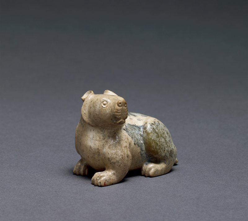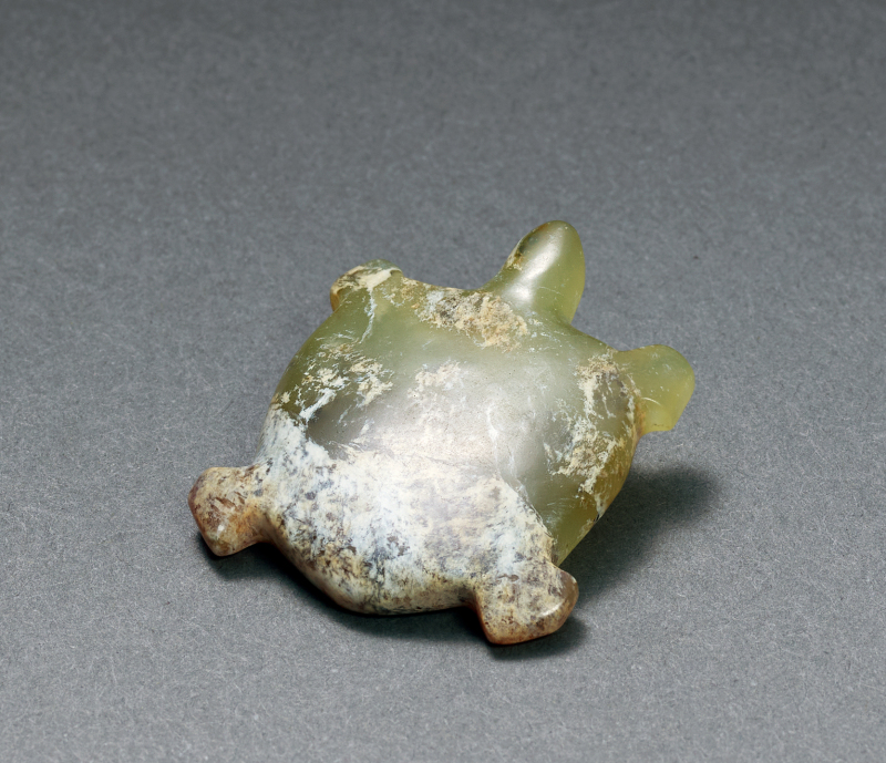 青白玉質圓雕成一小龜,龜呈爬行狀,頭部微昂,四抓短小,龜殼呈圓形,中間微微隆起,整體線條簡練,富有神韻。通體磨拋細緻,局部呈霜白與褐沁,精巧古樸,憨態可掬。龜腹上有一對橫向的隧孔,可供穿繩繫帶。 龜靈之信仰在中國玉器文化中有著悠久的歷史,距今五千多年前的紅山文化與淩家灘文化中,亦可見此題材之作品,這與通天禮神、搖卦占卜的神靈崇拜息息相關。龜是一種長壽的動物,亦是一種自帶居室的動物。這兩種特性,也許就是新石器時期先民們關注龜且崇拜的原因。新石器時期的人類,壽命很短,居無定所,因此他們期望能如同龜般的長壽、安居,這是他們足以繁衍族群戰勝自然界的一切可見和不可見的敵人的有力保障。 註腳 [1] 江美英:〈中國新石器時代玉器的形紋創意設計—以製作、紋飾與美學意涵為中心〉,《南華大學美學與視覺藝術學刊》2012年第4期,頁102。