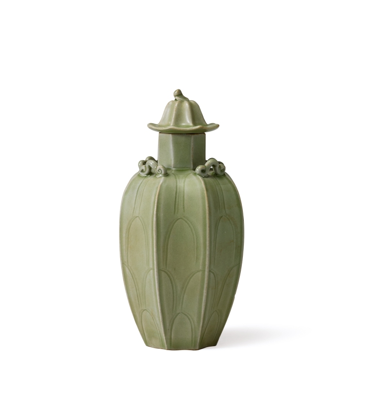 全器呈花口瓜棱腹,長頸,下承菊瓣式圈足,通體覆淡青釉,施釉均勻,釉面光潤,口沿及足緣局部有細小磕釉與窯粘,餘見窯內瑕點與自然縮釉。宋代龍泉窯瓜棱瓶是中國宋代龍泉窯燒製的青瓷珍品,以其獨特的造型和釉色著稱,此類瓜棱瓶多呈撇口、長頸、長圓腹,瓶身通體飾有瓜棱形的豎紋,口足外撇呈花瓣形,整體造型優雅規整。將宋代龍泉窯中的質樸與雅緻充分融合展現。 瓜棱瓶形狀仿似瓜果,瓶身的瓜棱線條柔順且古雅,表現出宋代陶瓷簡約卻不失精緻的風格。相較於其他時代及窯口的青瓷作品,龍泉窯瓜棱瓶以其獨特的結構、曼妙的曲線和溫柔的釉色而著名,是研究宋代青瓷藝術不可或缺的經典器物。龍泉窯位於浙江龍泉,燒製歷史悠久,南宋時期達到鼎盛。瓜棱瓶的製作技法包括以模具分兩模分胚垂合而成,其胎質處理需使用經過精細淘洗的瓷土,確保胎體質地細膩均勻,施釉厚度約0.1毫米,釉面呈現溫潤如玉的質感,此類瓷器不僅是實用器皿,也常作為藝術品珍藏,體現出宋代陶瓷工藝技術之高超和獨特審美追求。