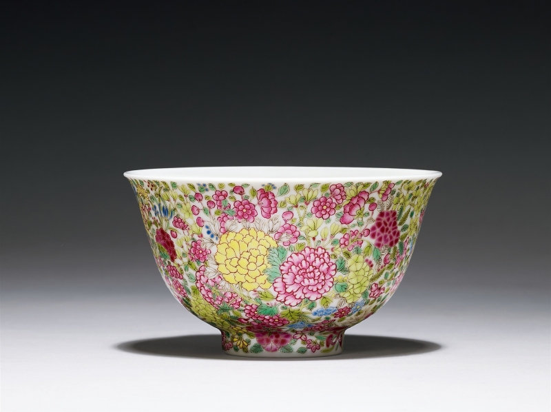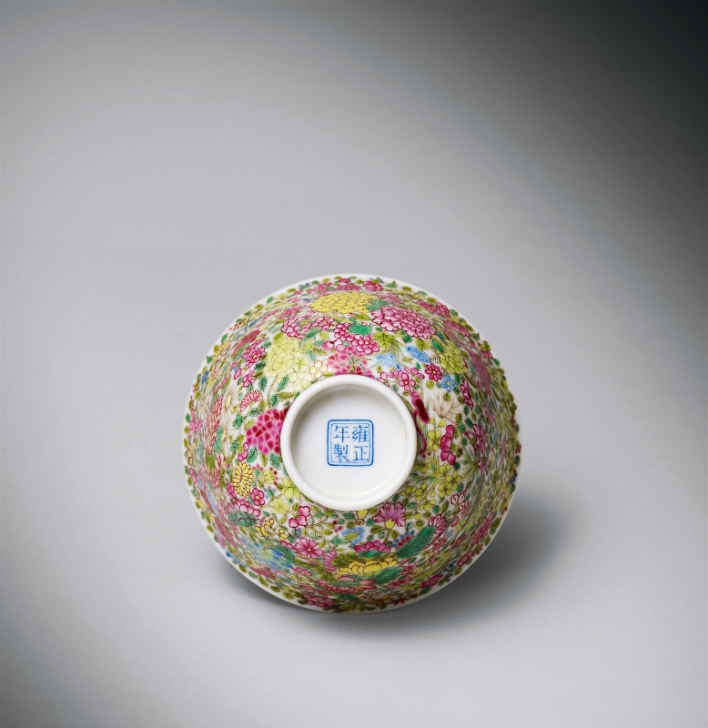 在施彩技法上,雍正時期的粉彩繪製工藝注重線條細膩,色彩組合較為和諧,追求簡潔明快,而到了乾隆時期,粉彩的繪製呈現出更加複雜的層次,一方面在底釉基礎上再加彩繪主紋,形成一種圖案浮現於錦緞上的視覺效果,另一方面發展出以剔彩技法輔助粉彩繪製,通過剔除部分彩釉以突出主紋,形成色彩與紋飾的對比,展現出細膩的立體感和精緻的裝飾效果,技藝更加爐火純青。