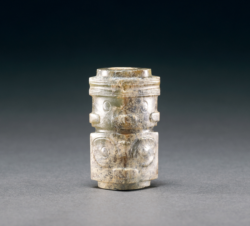 以青玉料雕琢而成一外方內圓的琮型玉勒,紋飾分為兩區塊,最上端做細密的平行弦紋環繞,上層是神人紋飾;下層則為獸面紋。玉勒四角作平直倒棱,中央通孔磨拋勻淨,通體可見霜白,局部帶有紅沁,質感古樸。 玉琮是良渚文化最典型的玉器之一。其形制內圓外近方,上下貫通,中間圓筒略高出方柱,上下凸起的部分被稱為「射部」。四方成角狀,良渚人以角作為中軸線,上下琢刻人面和獸面。良渚文化晚期,琮身略高,琢刻在琮上的紋飾也趨於簡化。