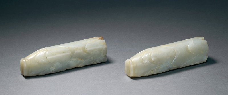 漢代玉雕趨於概括、重整體輪廓,本對以簡練曲線界定五官肢體,符合漢玉成熟風格。背脊與四肢以單刀深掘、推磨、圓底槽收筆,與滿城漢墓、洛陽、關中地區漢墓所出同類器一致。表面黃褐色沁層呈片狀散佈於低凹處,白化沿微裂蔓延,是長期埋藏的遺痕,與河北易縣滿城中山靖王墓與王后墓出土握形玉豕、玉虎,形制近似。在陝西北郊、西安灞橋一帶東漢墓出土之握豕,亦見同樣的筒形體量與陰刻處理。此種斜刀線刻工藝俗稱「漢八刀」,這是一種簡潔而有力的刀法,以大斜刀雕刻為主,線條粗獷而流暢,強調豬的形態輪廓和立體感,特別是在豬的鼻吻、耳朵、四肢等部位刻畫典型特徵,因追求實用與象徵意義,雕刻線條俐落,制作較為快速。