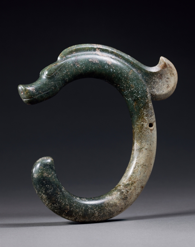 本件以整料碧青玉圓雕而成,體量高達20公分,十分碩大。玉質微透明,色呈青灰間雜褐色沁斑,表面可見自然風化紋與舊磨拋痕跡,器形呈C形,龍首微昂,口部微張,吻端圓潤,下頷內收,頸背隆起一道棱脊,尾部內卷,無爪無角,鬣鬃飛揚。整體輪廓渾厚而流暢,龍身一側鑽有小穿孔,應為懸掛或佩系所用。 紅山文化代表的西遼河流域古文化,在耜耕農業空前發達的大背景下,紅山先民製造了大量玉器,不僅用於祭祀,更重要是用於區分等級。