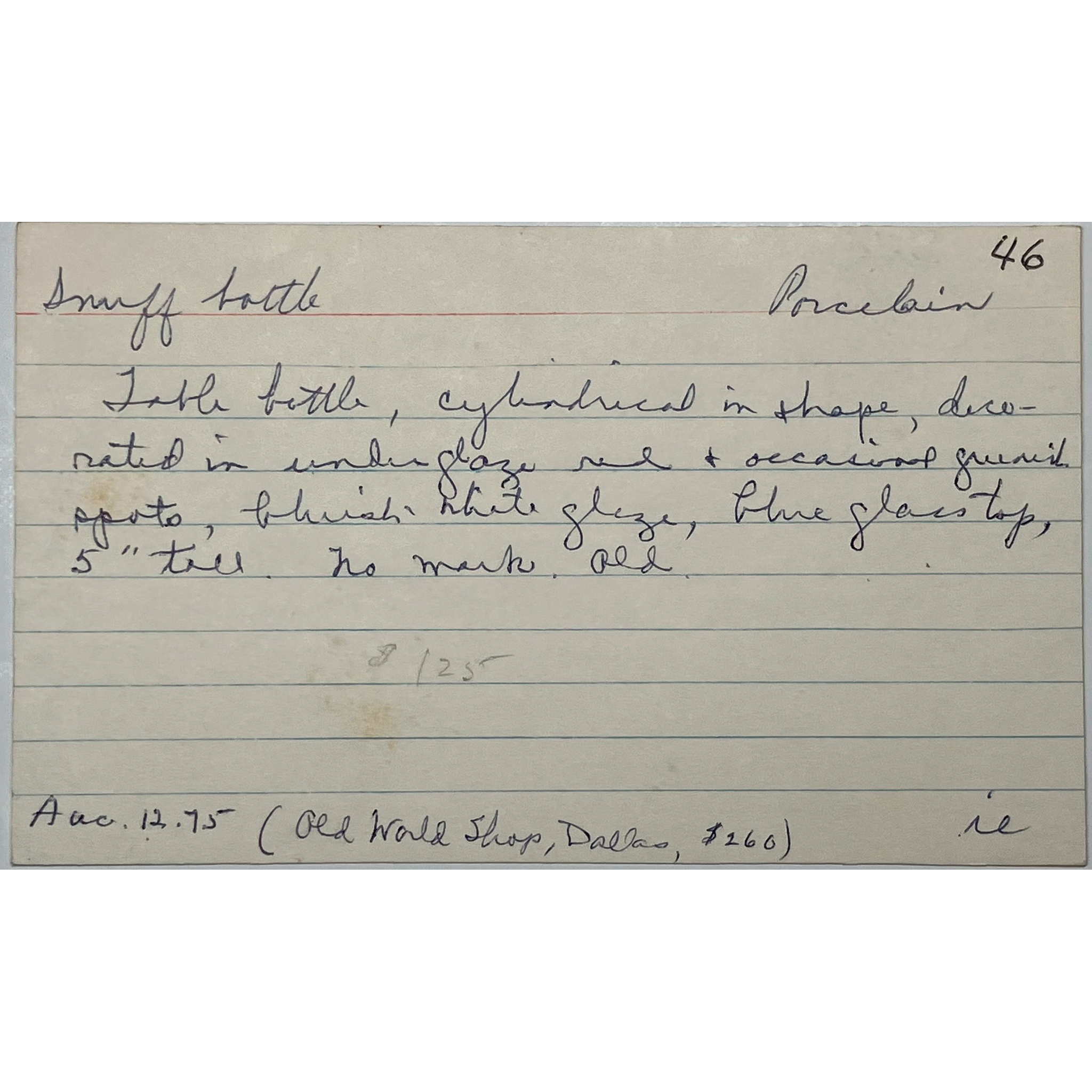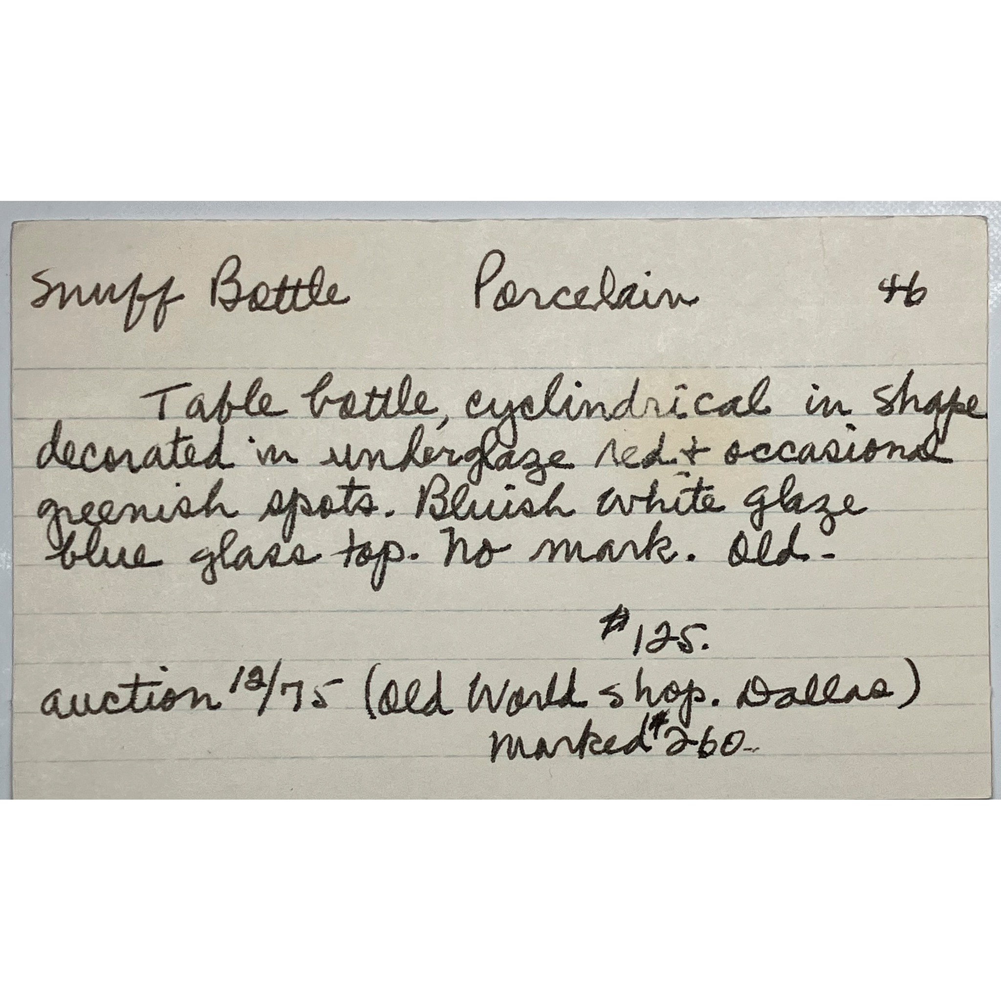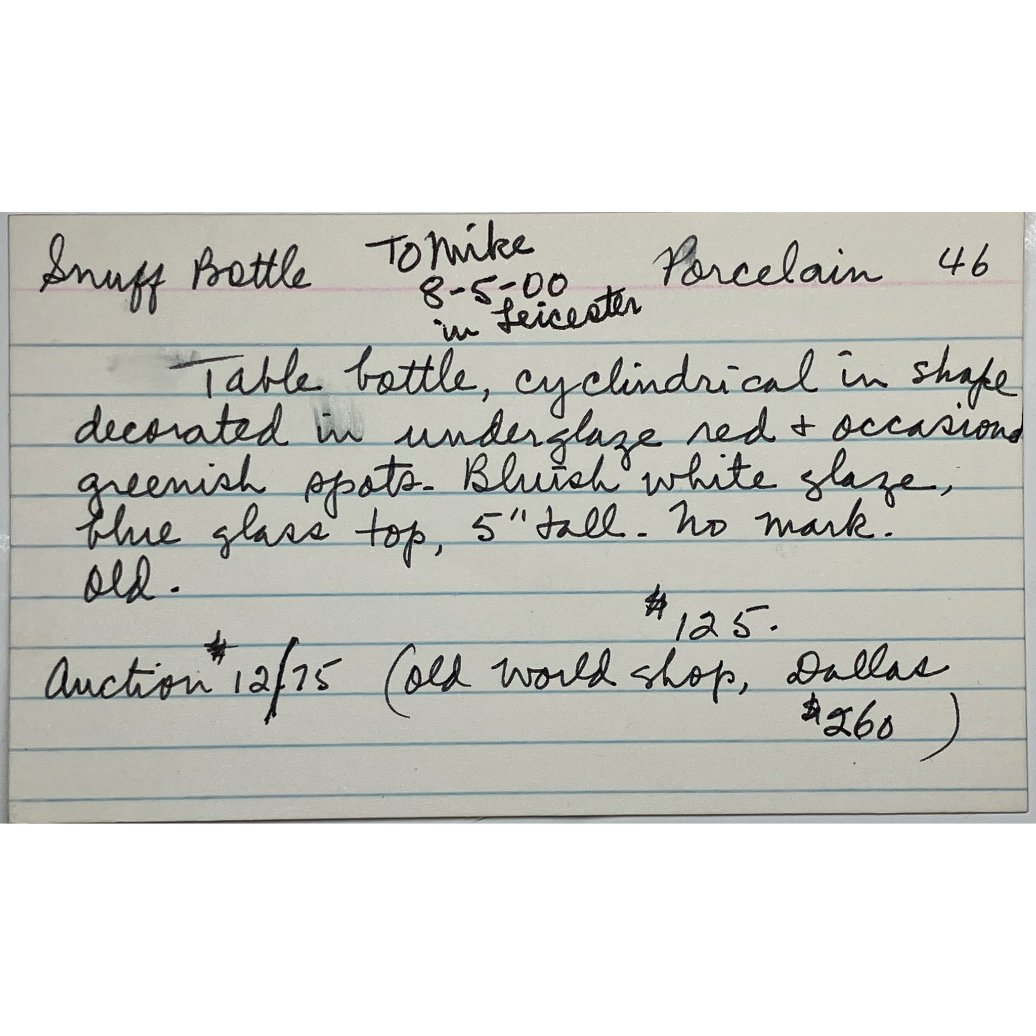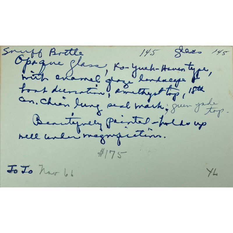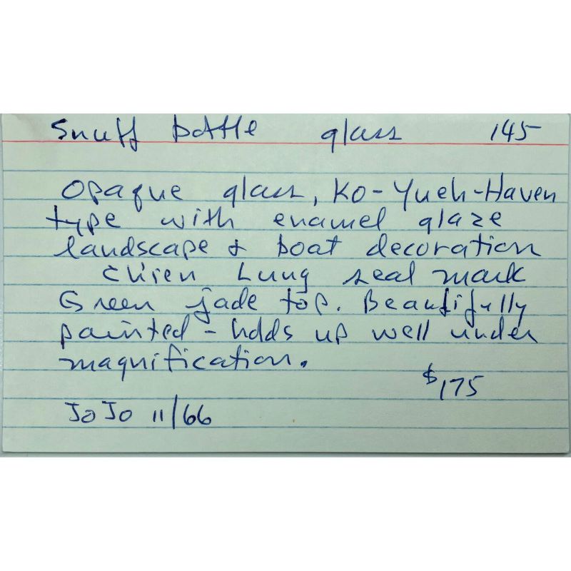 来源:J. Gilbert博士及Cora McAllister贤伉俪旧藏,后由家族承传。附藏家手写笔记及收藏编号145。1966年透过Joseph Jones购自香港Dunt King。含1966年6月3日签发之收据原件,其中释文:「二号,涅白料鼻烟壶一件,古月轩风格,饰以珐瑯彩山水舟舫,配紫水晶盖,十八世纪,书乾隆款[港币200.00]」。另附Joseph Jones手绘此鼻烟壶图,及一封致Gilbert和Cora的信,书于香港大学英文系擡头信笺上,日期为1966年6月7日。