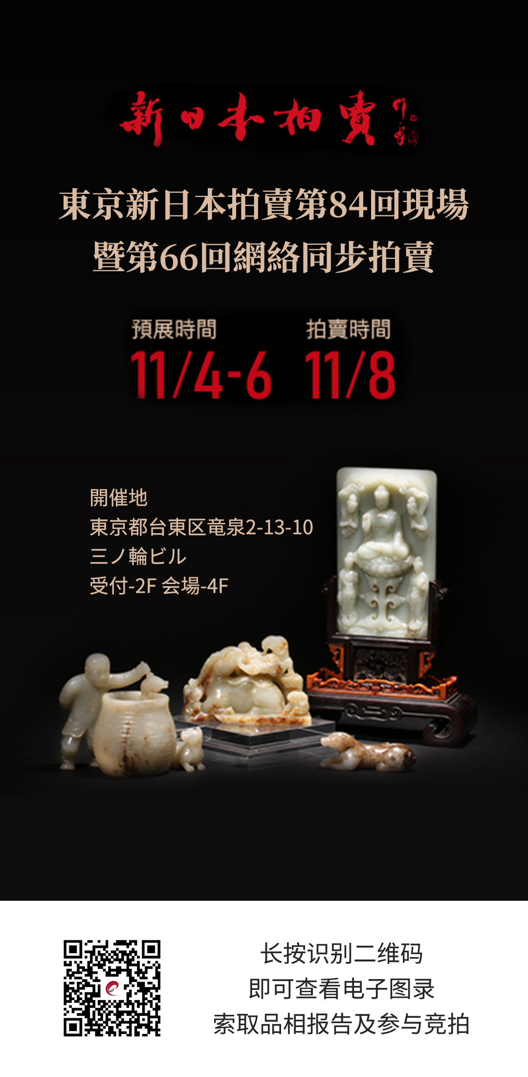 日本拍卖季热度持续攀升,市场目光再次聚焦东京。北京时间11月8日,东京新日本将迎来「第84回现场暨第66回网络同步拍卖」,延续其每月8日定期举槌的"月拍"特色。连拍臻全程直播,并提供实时同步竞拍技术和服务支持。