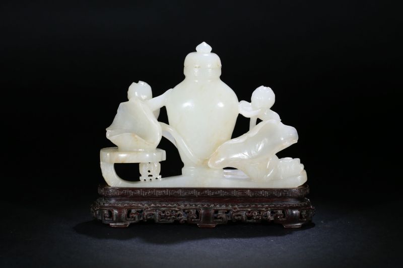 清 白玉荷花如意瓶連座