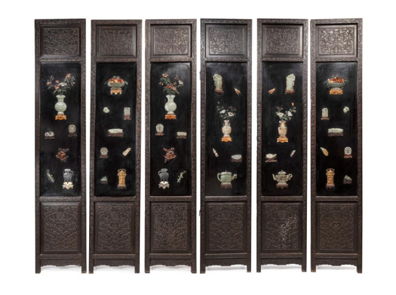SIX LACQUERED WOOD WALL PANELS WITH JADE AND HARDSTONE INLAYS, CHINA, LATE 19TH / EARLY 20TH CENTURY