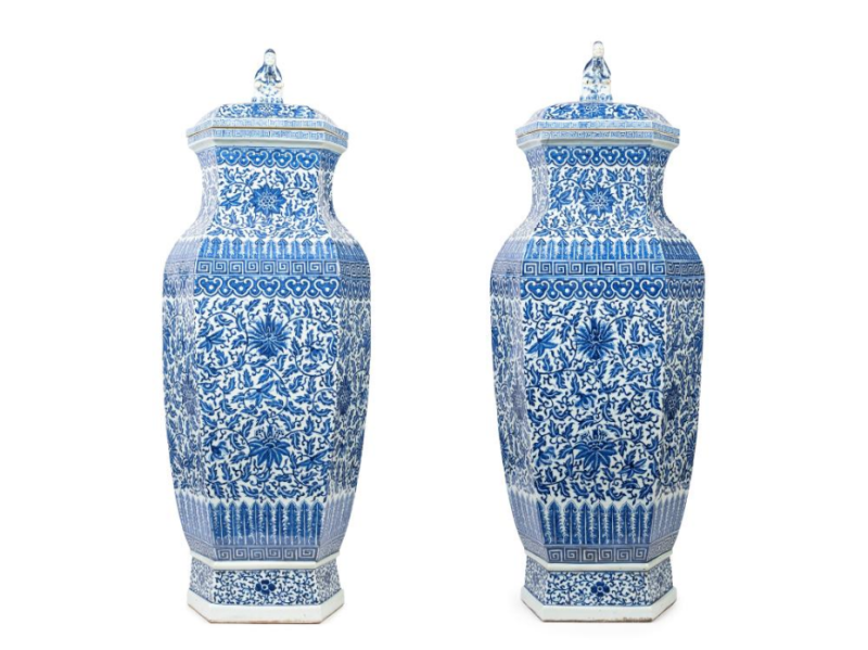 A VERY RARE PAIR OF HUGE BLUE AND WHITE HEXAGONAL BALUSTER-SHAPED PORCELAIN VASES, CHINA, QING DYNASTY, 18TH / 19TH CENTURY