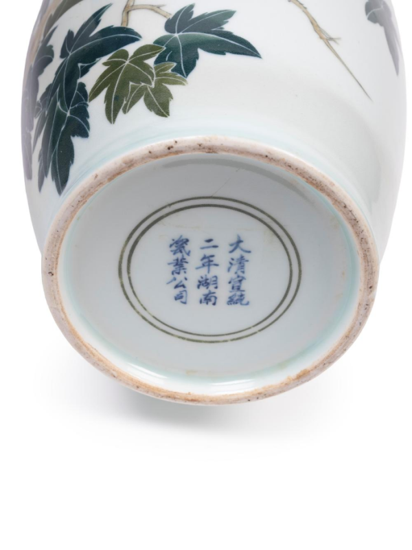 瓶撇口,釉下彩绘双鹦鹉栖枝图,底青花书「大清宣统二年湖南瓷业公司」款。1905年熊希龄等改革家于醴陵创办湖南官立瓷业学堂,次年成立湖南瓷业公司,创烧醴陵釉下五彩瓷。本品以多色金属氧化物绘制,融传统中国画与雅致风格于一体,艺术表现力卓绝。醴陵瓷屡获国际博览会殊荣,广受海内外推崇,此瓶乃其典范之作。