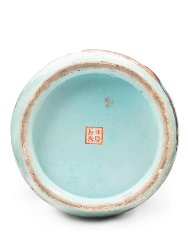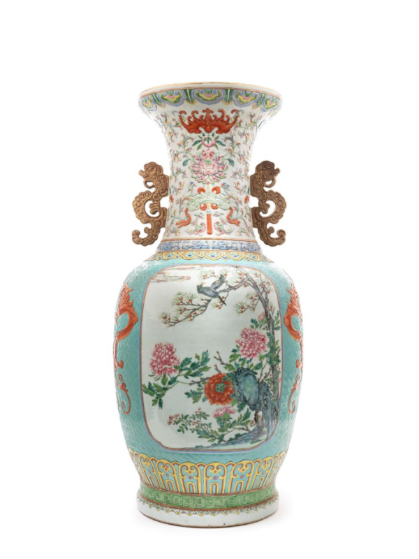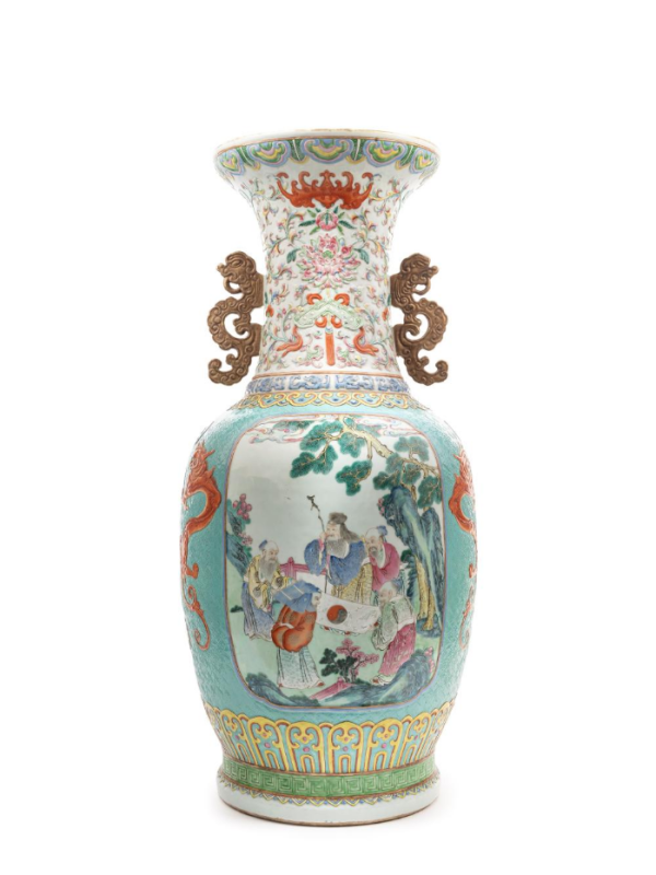 同场亮点还包括可能为乾隆时期的清翡翠狮纽绳纹方鼎,出自罗马宝格丽旧藏,器形庄重,绳纹装饰古朴典雅;以及清嘉庆松石绿地粉彩轧道开光人物故事图大瓶、光绪“大雅斋”款绿地粉彩九桃纹双耳瓶等官窑精品,均为市场难觅的陈列雅器。各类珍品共同勾勒出一幅绚烂的东方艺术画卷,值得藏家重点关注。