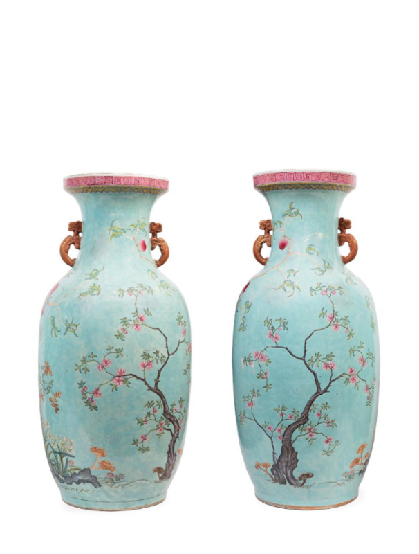 这对花瓶以绿地为地,绘有九桃纹,桃在中国传统文化中象征长寿,搭配竹、石、花卉等元素,色彩丰富艳丽,工艺精湛。螭龙形双耳,颈部有“大雅斋”圆形款识,口沿饰有回纹,整体构图饱满,寓意吉祥,瓶底则刻有“永庆长春”四字款。大雅斋款瓷器是清景德镇官窑瓷器品种之一,为光绪时慈禧太后御用,是那一时期比较少见的精品,也是研究慈禧太后审美与晚清宫廷生活的重要实物资料,具有较高的艺术和历史价值,至今仍是藏家追捧的器物。