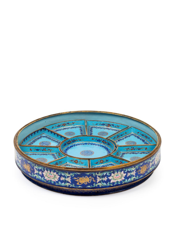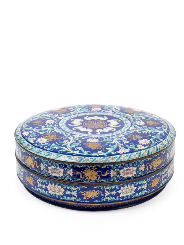扁圆形盖盒,盖面微穹隆。蓝珐琅地饰金彩缠枝莲纹,中央五蝠拱寿字,环饰佛教八宝纹。盒内设八扇形攒盘围中央圆碟,分饰蝙蝠、缠枝及吉祥纹。