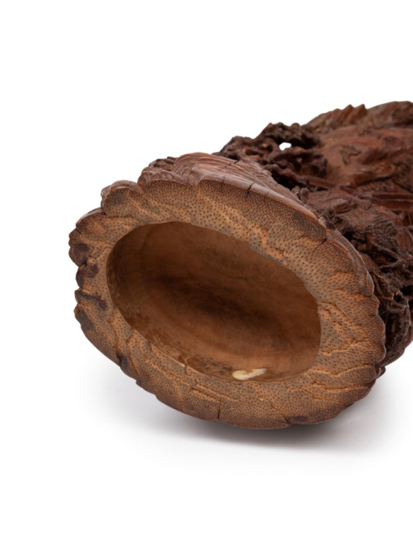 取天然竹根雕层叠山峦,高浮雕技法刻亭台楼阁隐现松石之间,文人雅士聚集其中,意境清雅。