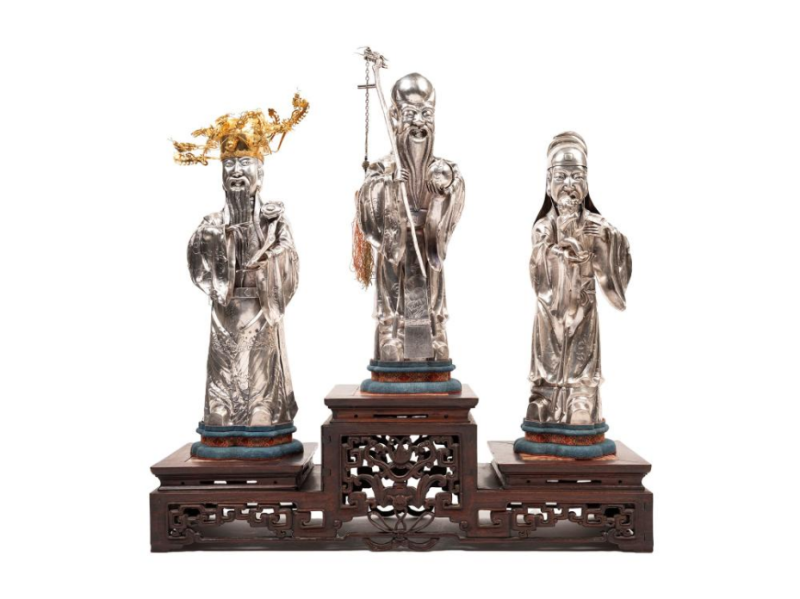银质精錾福禄寿三星立像,着錾花锦袍,依传统仪轨立于木座。