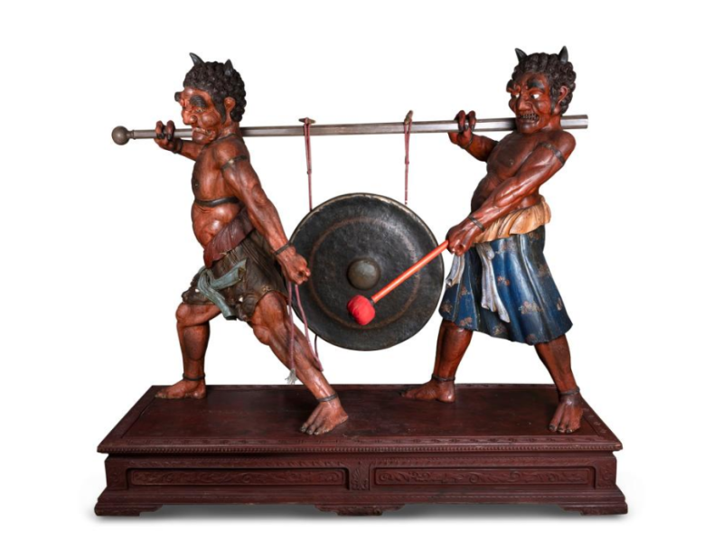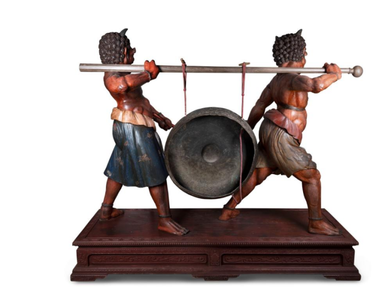 双鬼朱黑漆雕,肌理贲张,神态狞厉,共拾巨锣作仪仗行进状。