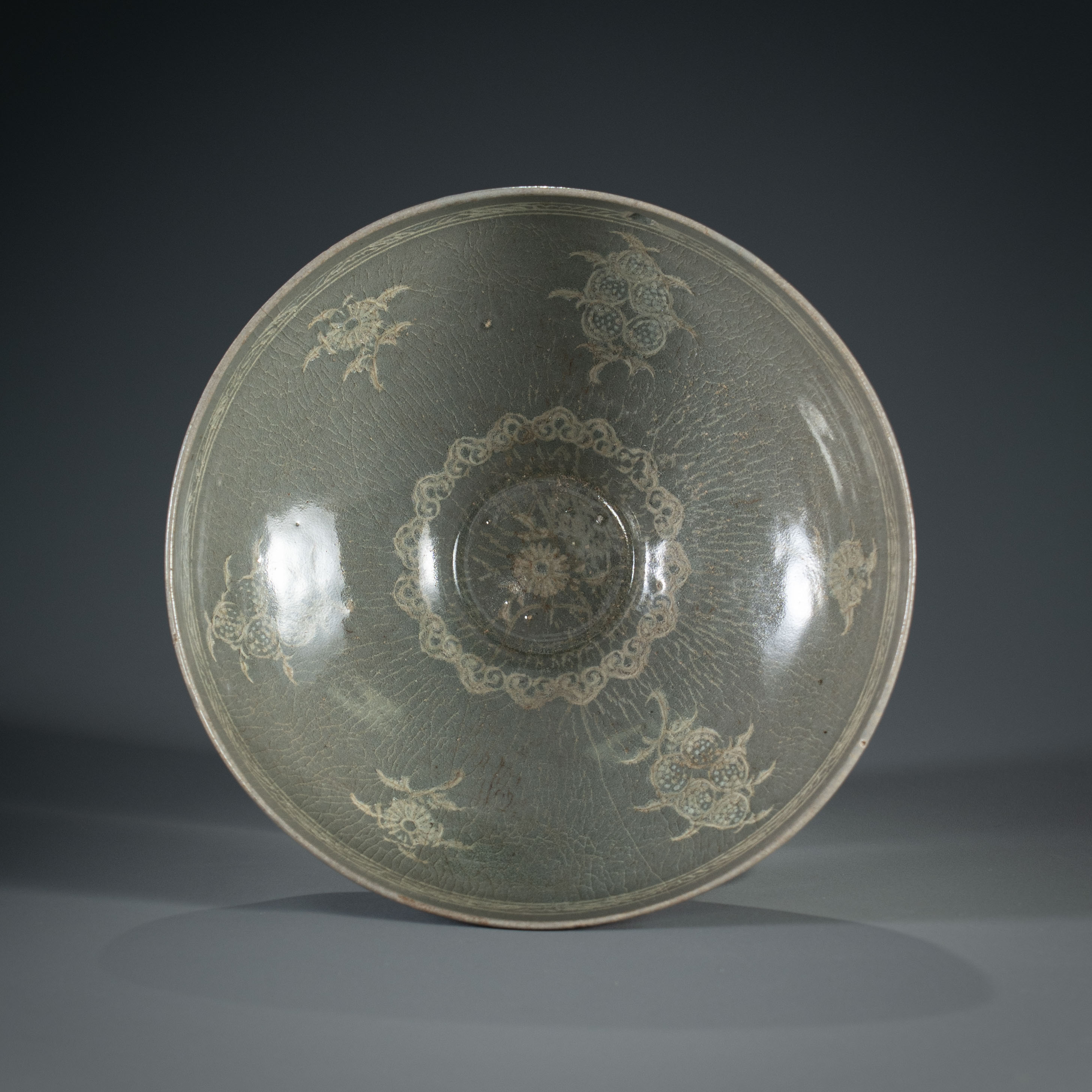 参阅:可参见一例同款高丽青磁碗曾早年售于纽约佳士得,落槌价3750$。另见一例图案花纹相似高丽青磁碗藏于东京国立博物馆,编号TG-79。