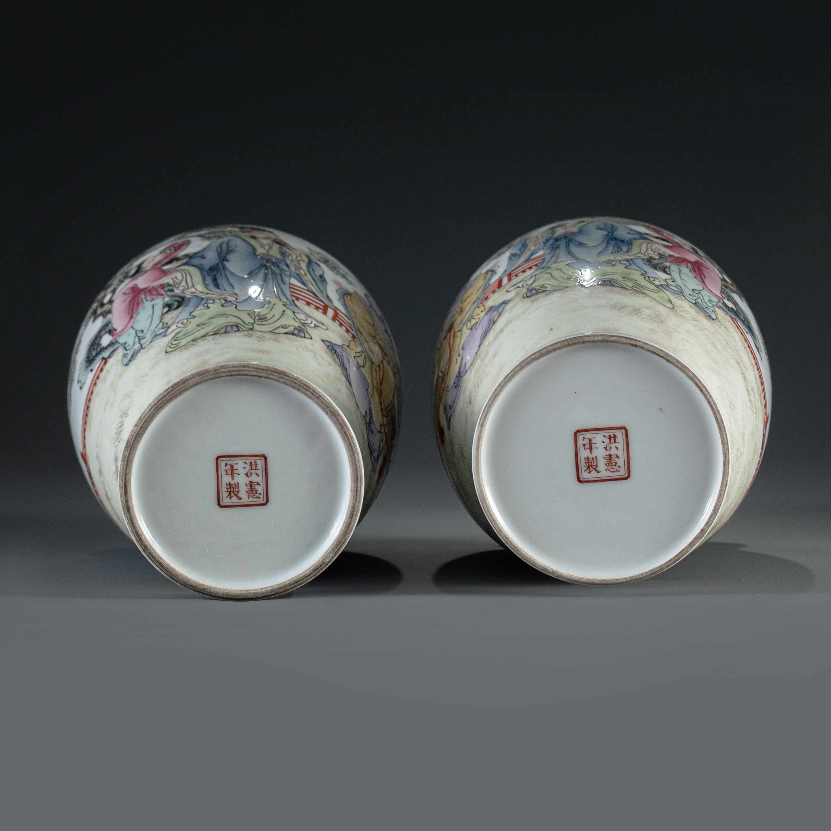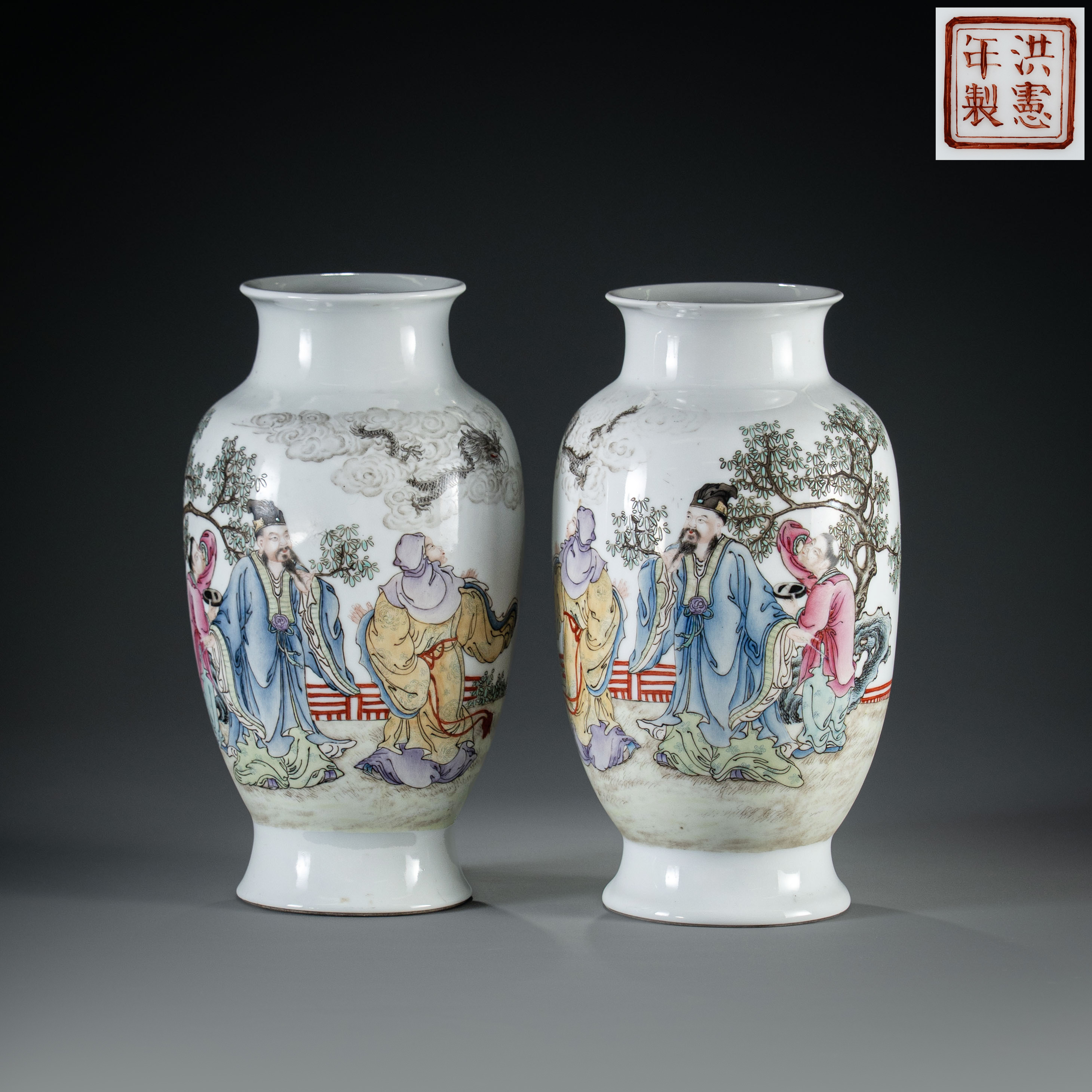 此件拍品瓶身通体以粉彩绘“画龙点睛”故事图。典出《历代名画记》,讲述南朝梁画家张僧繇于金陵安乐寺画龙,点睛后龙破壁腾飞之神迹。画面中,高士(张僧繇)峨冠博带,手执画笔,神情肃穆自信,正仰首凝视天际;身旁两名侍者一捧砚台、一举手遮眉仰望,神态惊讶生动,极富戏剧张力。半空中彤云密佈,一条墨龙穿云破雾,龙隐云中,神龙见首不见尾,极具动感。 整器画工精湛,人物衣褶流利,开脸生动;粉彩发色明丽雅致,不仅有传统文人画之意境,更兼具洪宪瓷器独有的富丽堂皇。底书矾红“洪宪年制”双框楷书款,字体端正。洪宪瓷为袁世凯称帝时期的“御窑”瓷,烧造时间极短(1915-1916年),传世真品稀少,成对保存且画片如此精细者,更显珍贵。