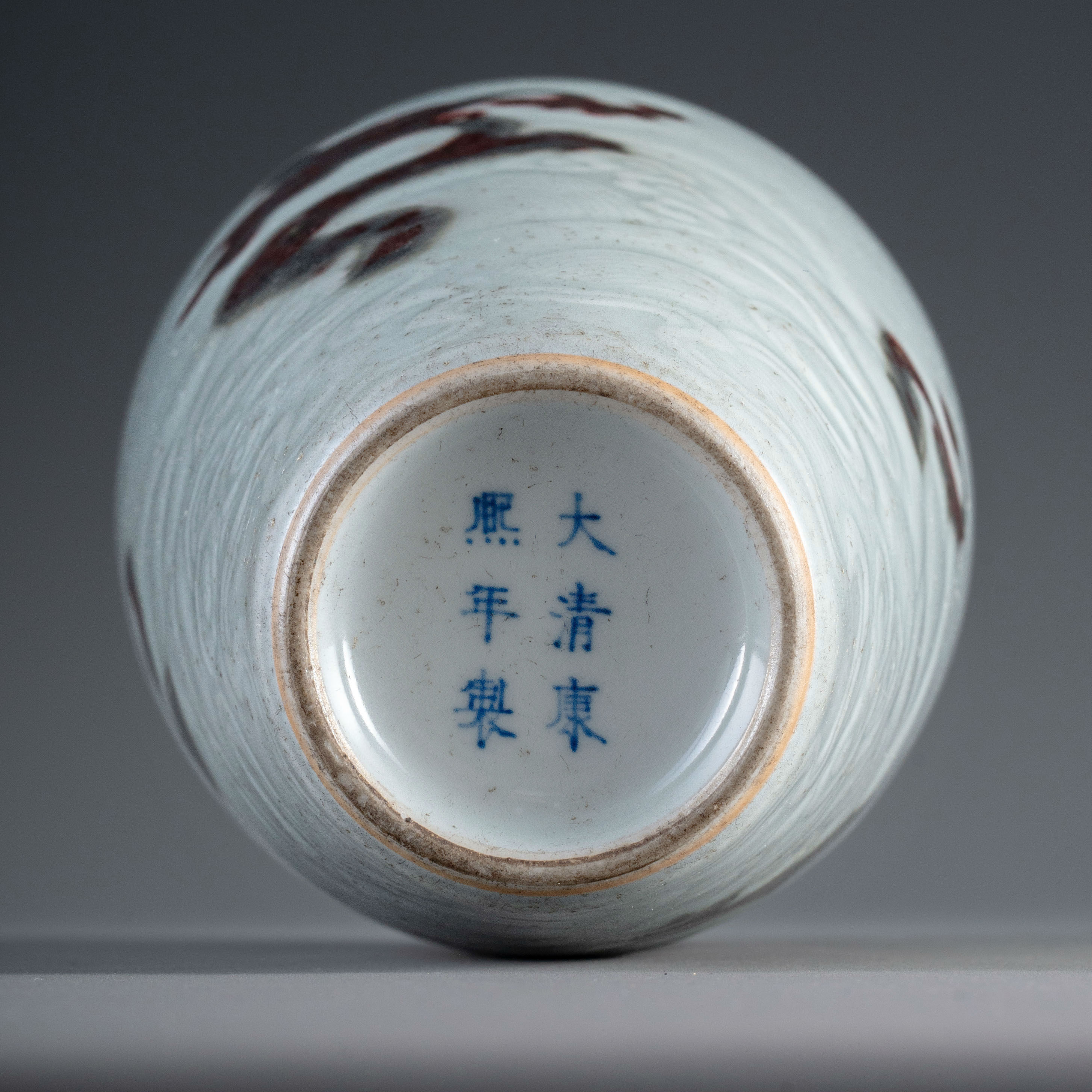 本品造型端庄优雅,为康熙时期御窑名品“八大码”文房制式之代表。器形呈莱菔尊样式,颈部饰以三道凸起弦纹,故又称“三弦尊”。其制作工艺融合了暗刻与釉里红两大高难度技法:器身先以流利刀法在胎骨上暗刻汹涌的海水波涛纹,再以铜红料绘就昂扬之三爪龙纹。此类龙纹具备显著的高古艺术风格,反映了康熙皇帝对上古青铜器及其纹饰的推崇与雅好。 在烧造技术层面,釉里红对窑温及还原气氛的要求极其严苛。本品之龙纹呈色沉稳内敛,带有铜红元素自然转化的过渡色泽,展现了康熙朝釉里红工艺在探索时期的真实面貌。其色调与白釉相互衬托,在莹润的釉面下显得气韵古厚。