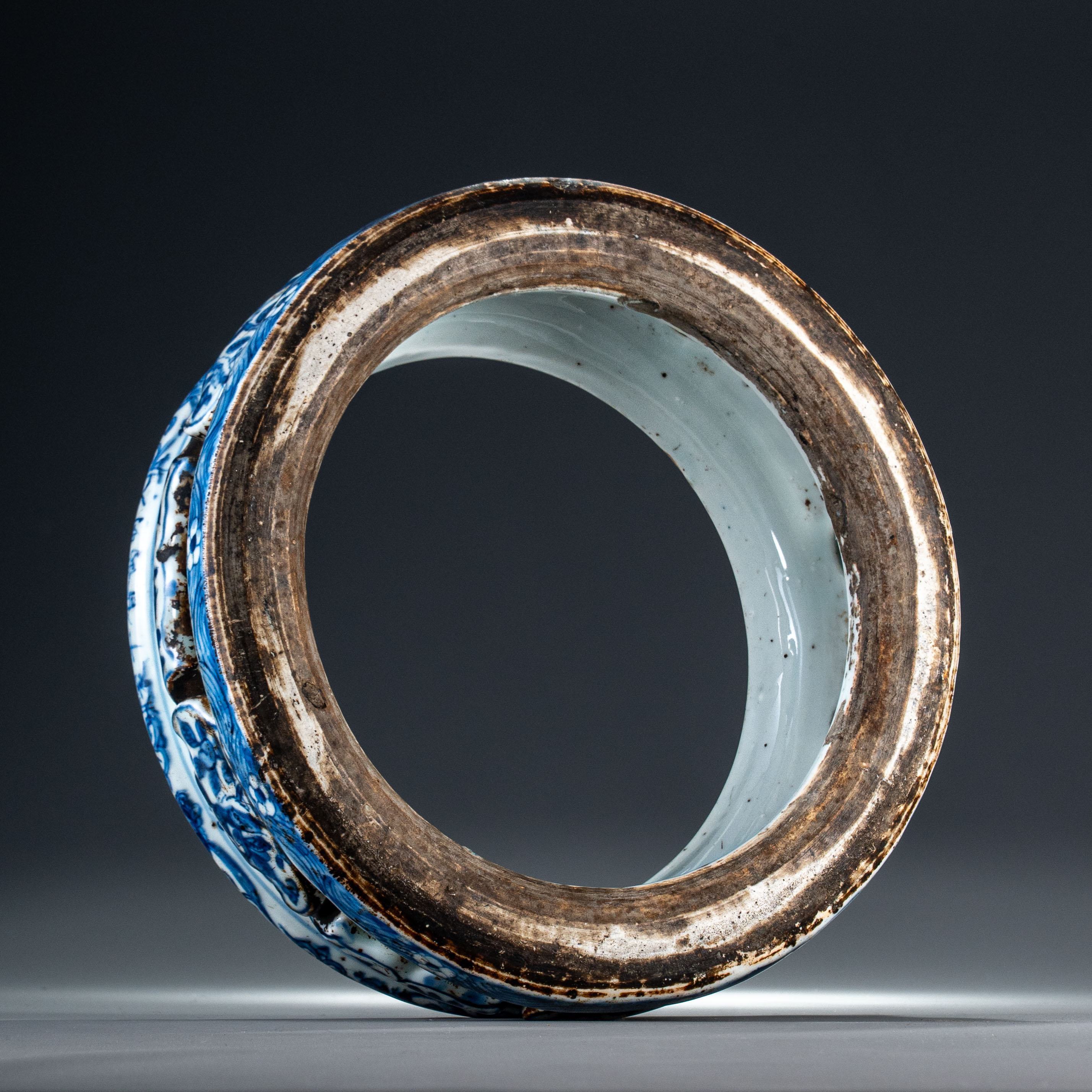 此器形制特殊,呈圆环状,上下透空,结构稳重,展现出明代晚期器座类瓷器的厚重之美。口沿下方横书“大明万曆年制”六字楷书款,字迹流畅,具备鲜明的时代特徵。 整器装饰层次井然,工艺运用极为繁複。最引人注目的是腹部採取“镂空”技法,开孔均匀,将虚实空间巧妙连结。外壁满绘青花纹饰,色泽沉稳中见浓艳,笔法率真,富有动感。腹部主体装饰花果纹,枝蔓舒展自然,果实饱满,寓意吉祥繁茂;底足处则辅以翻腾的海浪纹与灵动的卷草纹,构图疏密得当,视觉效果饱满且极具韵律感。 此座胎体厚重扎实,釉面滋润泛青,将万曆时期“繁褥华丽、古拙大气”的艺术风格发挥得淋漓尽致。