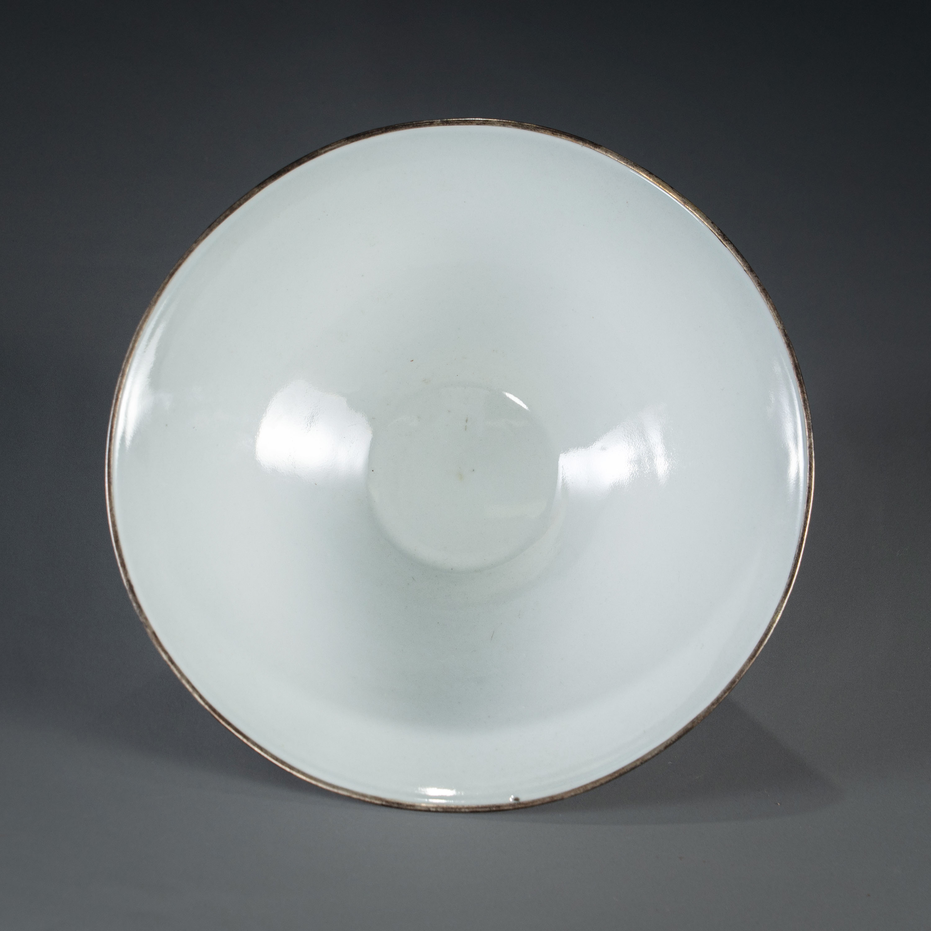 此件明代青花松竹梅纹斗笠碗,器型舒展大气,呈经典的斗笠状,口沿斜直外撇,底承小圈足。其口径达23釐米,相较于常见的碗类器物,体量尤为开阔,线条俐落,具有极佳的视觉衝击力与陈设感。整器胎质洁白坚致,施釉肥厚润泽,展现了明代青花瓷器优良的质地。 画面核心纹饰为寓意高洁的“岁寒三友”——松、竹、梅。画笔洒脱而不失法度,青花发色明丽沉稳,浓淡之间尽显中国水墨画的笔墨神韵。苍松蜿蜒如龙,针叶错落;翠竹清劲,枝叶扶疏;冬梅傲雪,花瓣清雅。松竹梅题材在明代文人阶层中备受推崇,象徵著坚毅不屈的人格理想,此碗将这种文人情趣完美複刻于瓷面上,意境深远。 器物底部修足规整,圈足由于胎质细腻,呈现出干洁的质感。此类大尺寸的完整斗笠碗存世量极其罕见,多作为宴饮中的高级盛器或文房陈设,既具有极高的实用功能,又承载了浓厚的历史文化气息,是收藏与研究青花瓷器审美的珍稀实物。